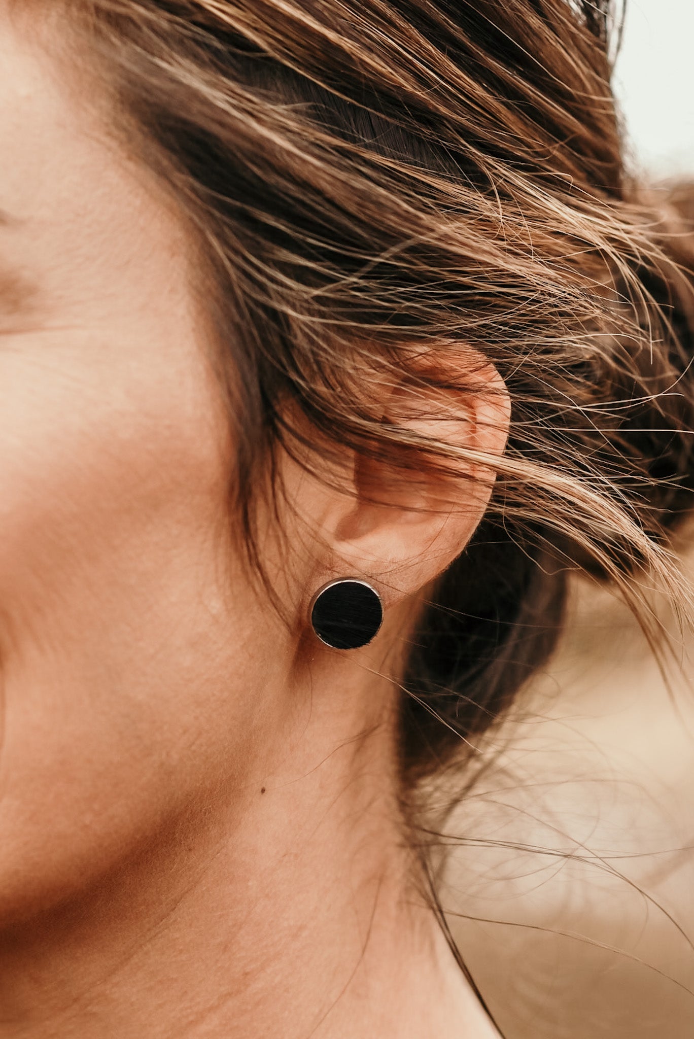 Small button stud style earrings made of black hair on cowhide. 1/2” across and encased in a silver casing