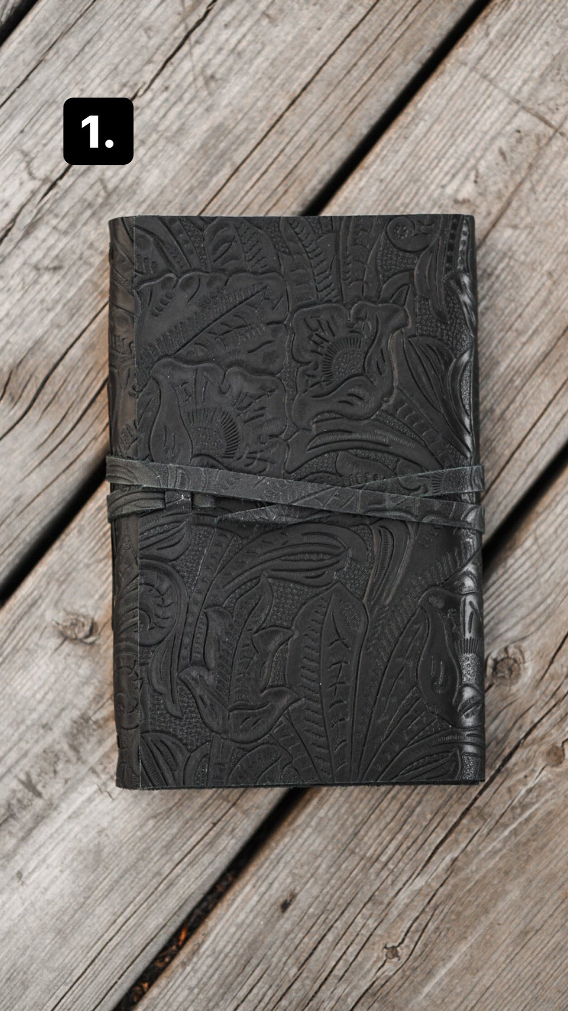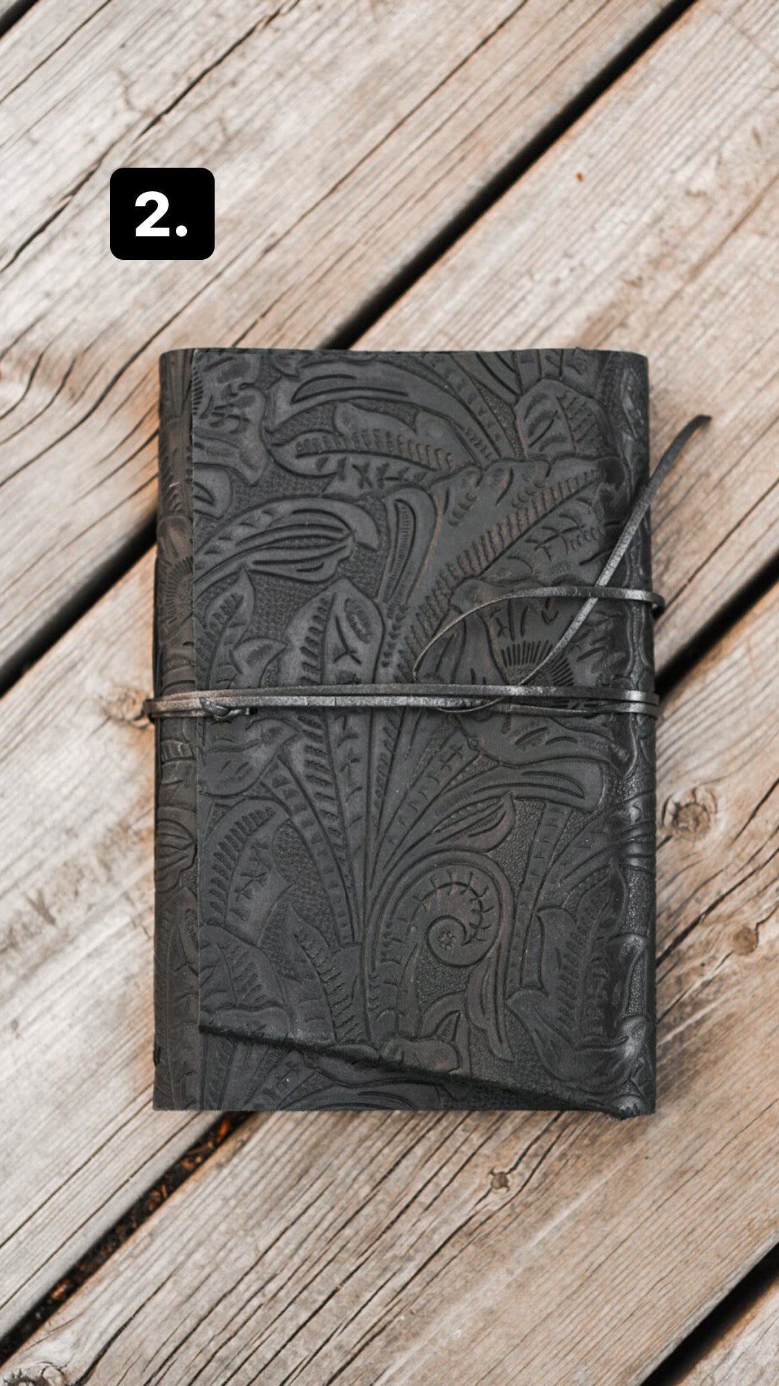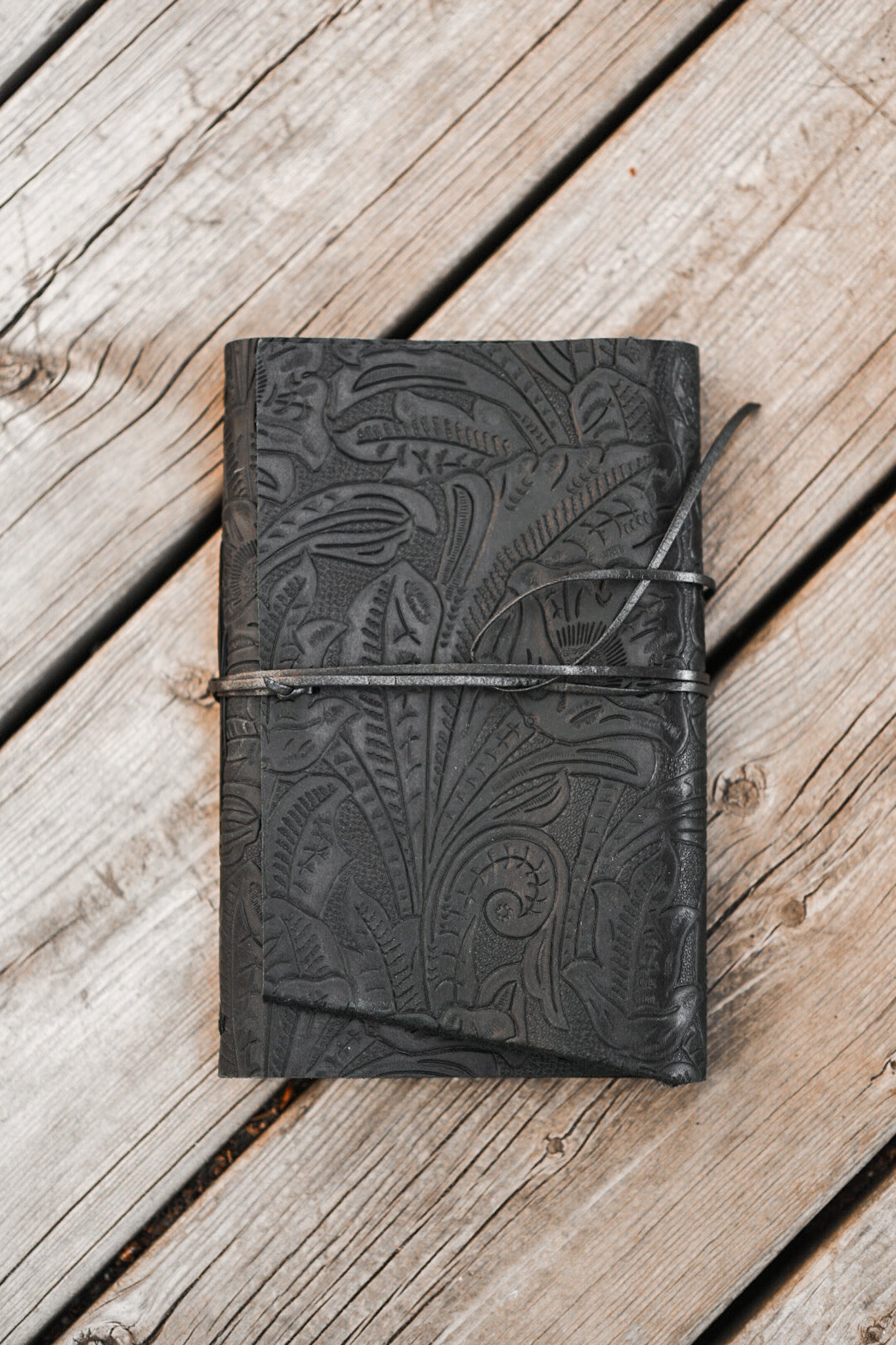 Black embossed leather journal with wrap style closure on the flap. Approximately 9” tall x 6” wide with 120 lined pages. Geometric style stitching for the binding.