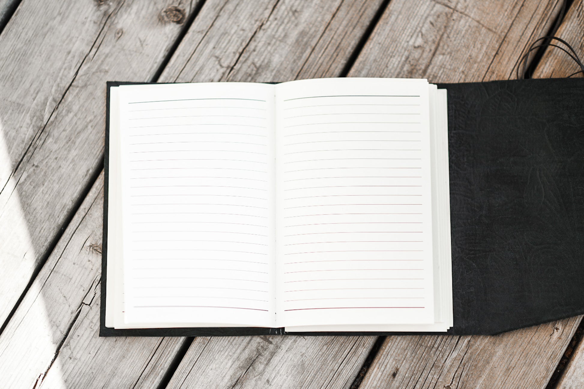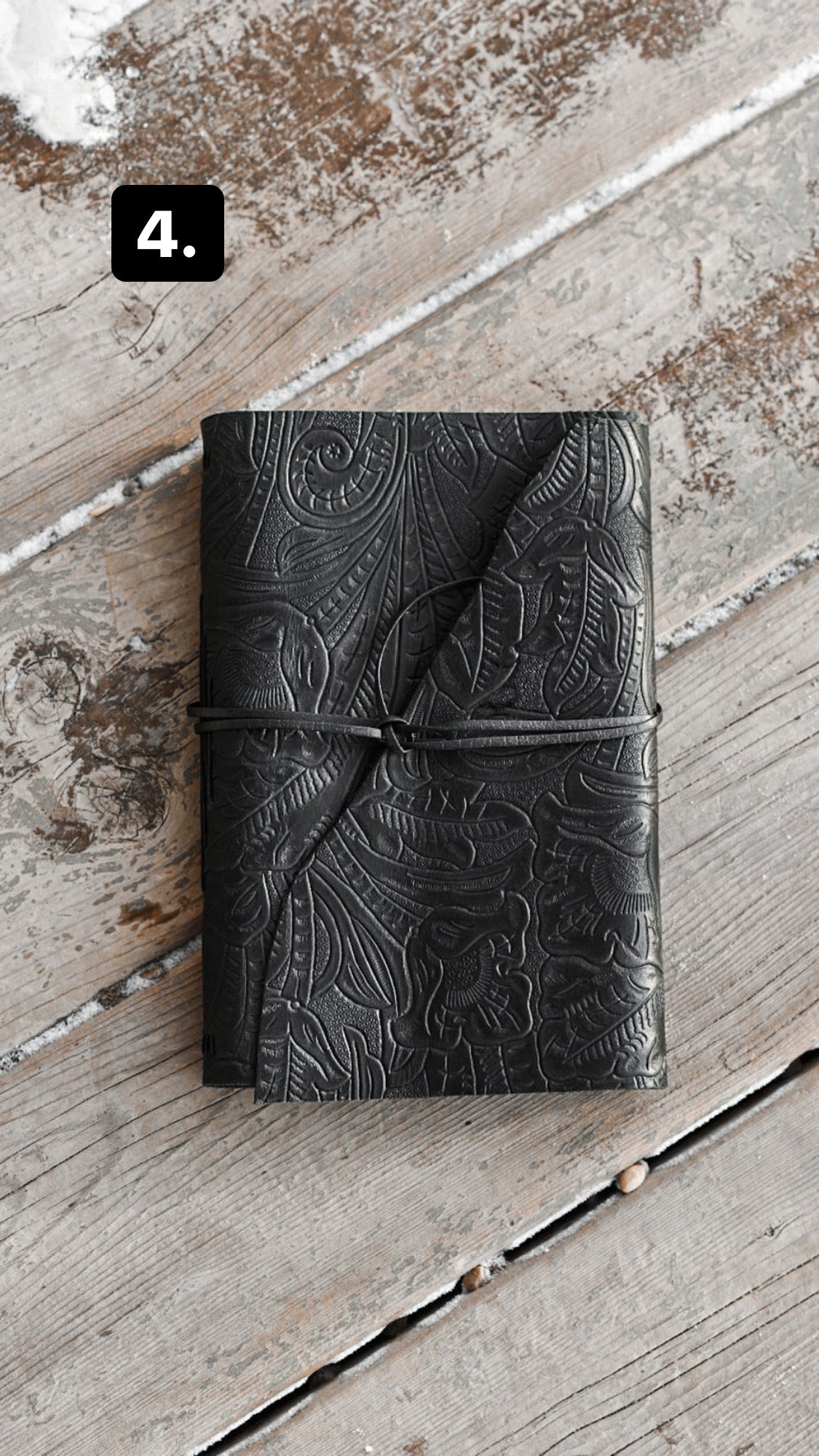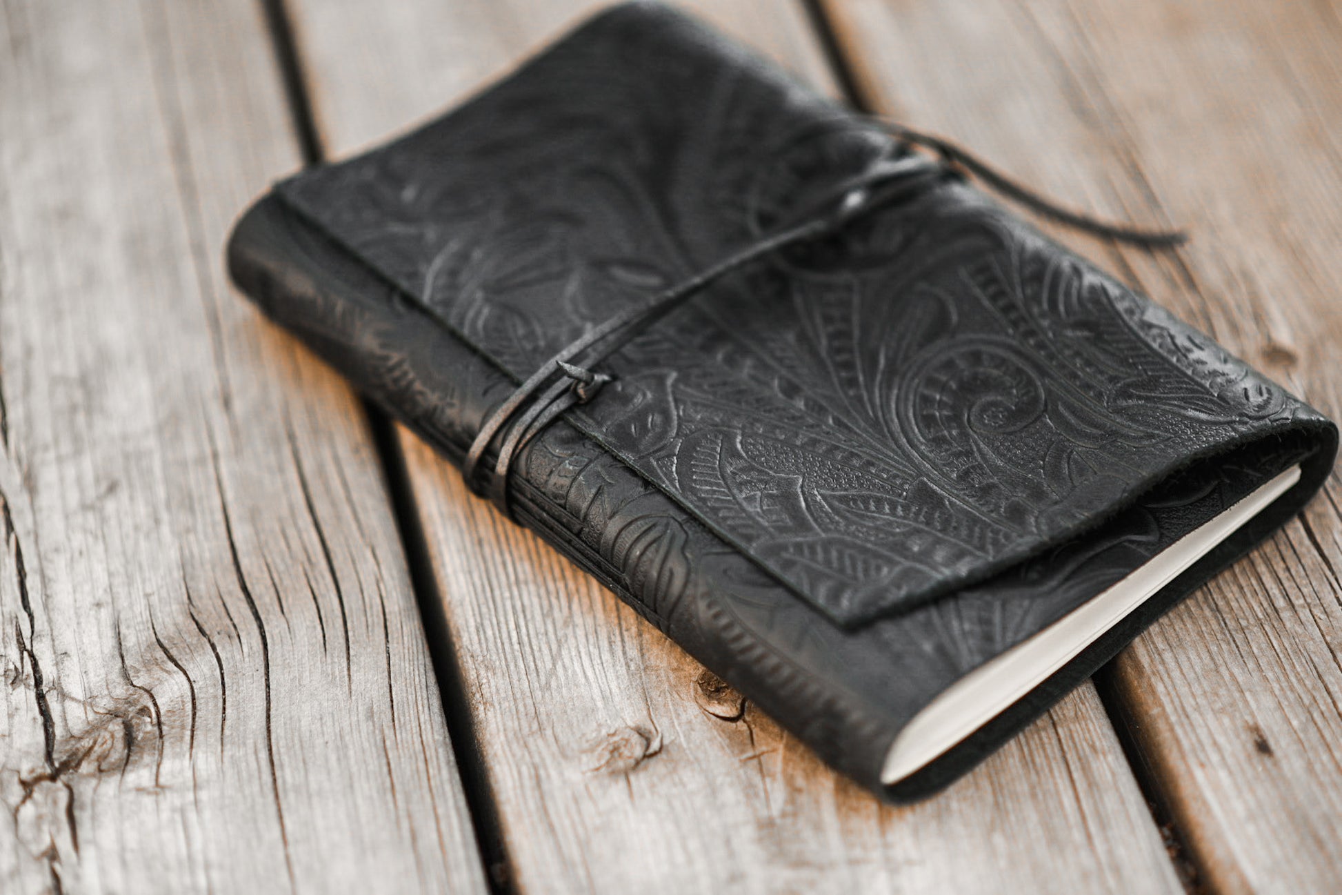Black embossed leather journal with wrap style closure on the flap. Approximately 9” tall x 6” wide with 120 lined pages. Geometric style stitching for the binding.