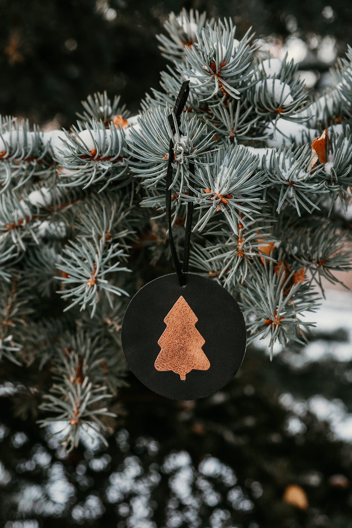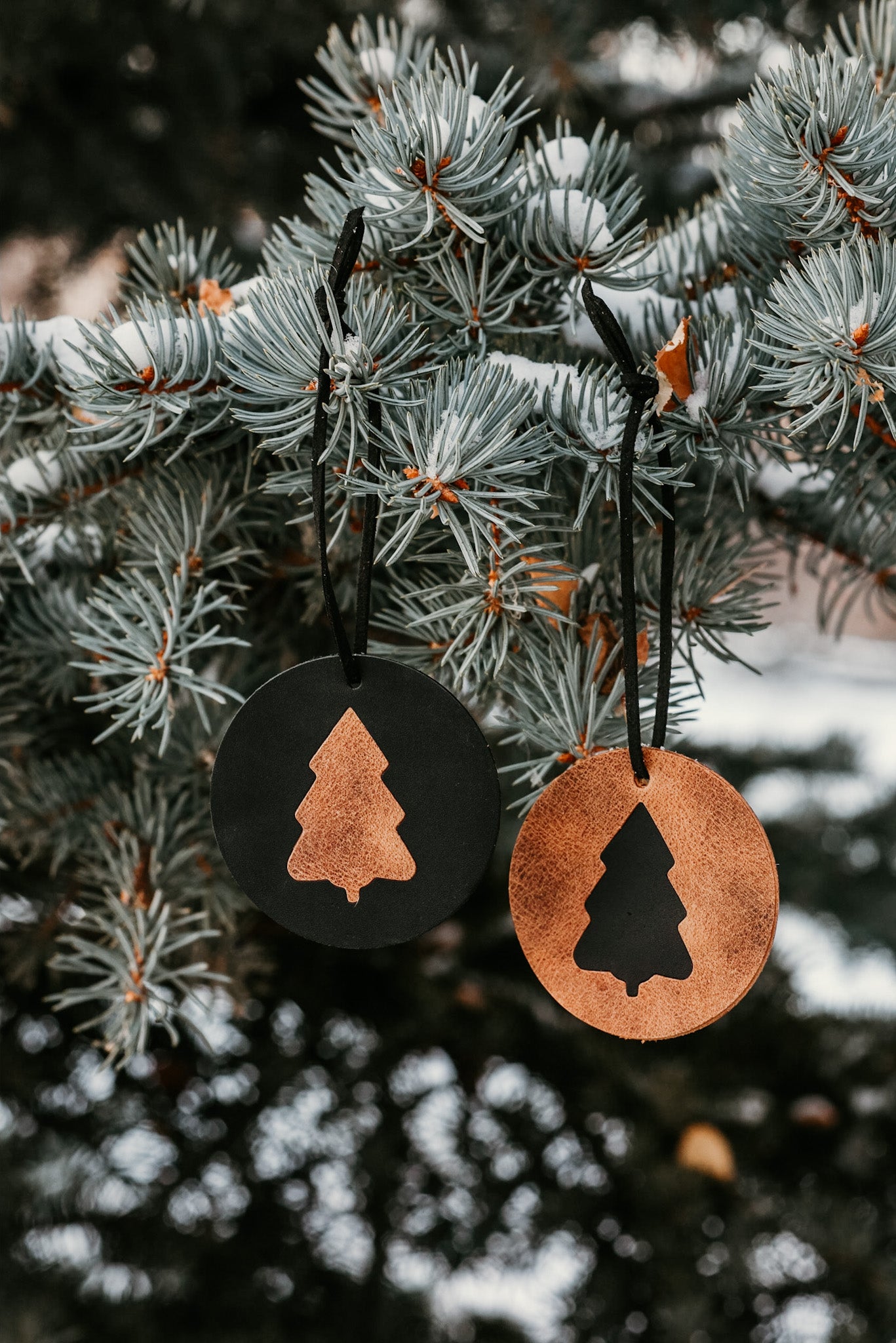 Circle Christmas tree ornament with a Christmas tree shape punched and input into the middle. 3.5” wide with a leather string for hanging!