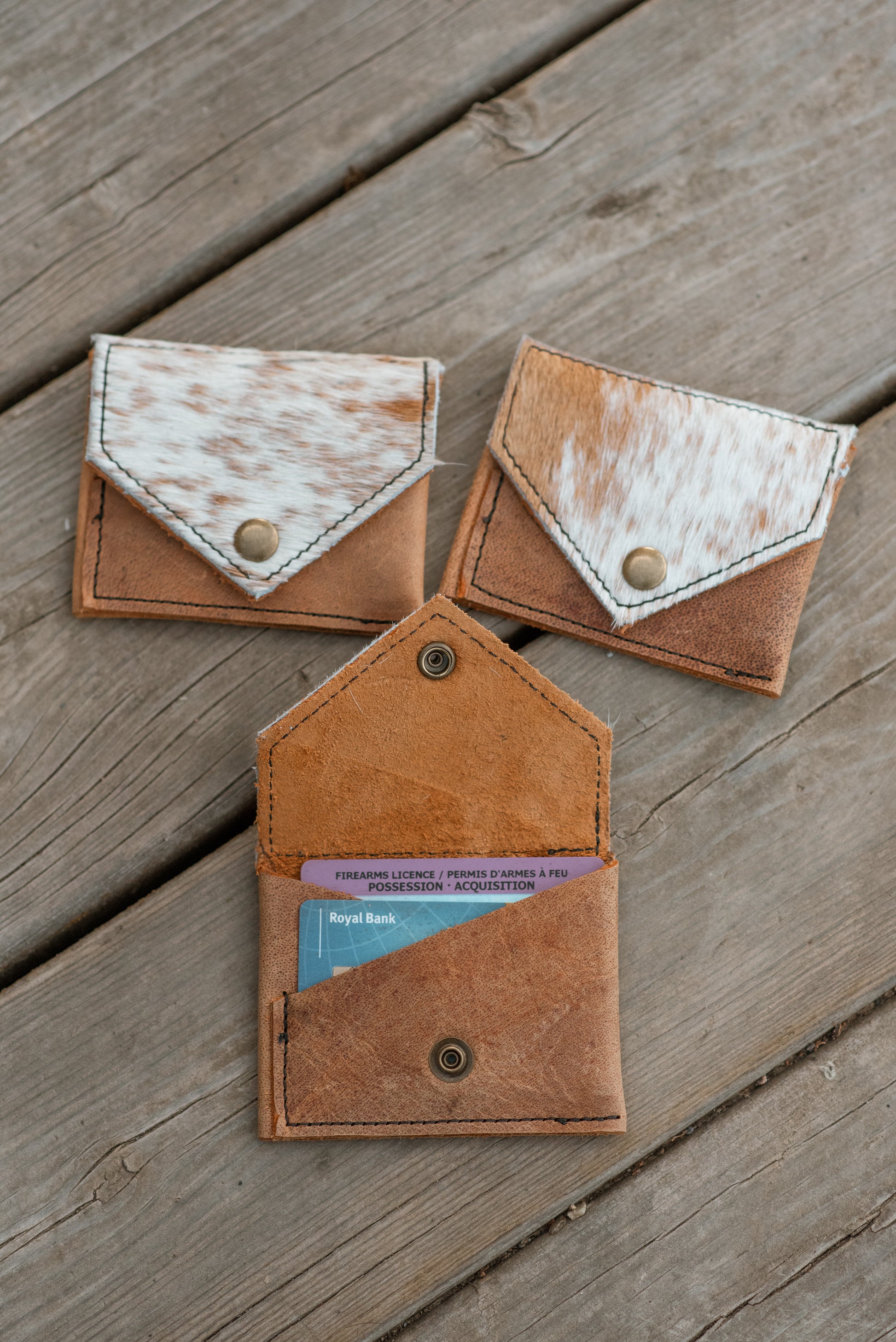 A wallet for cards.. made with cowhide. Also with genuine leather because that’s what we do around here. Two slots inside but they hold at least 2-3 cards or more.. depends how determined you are!