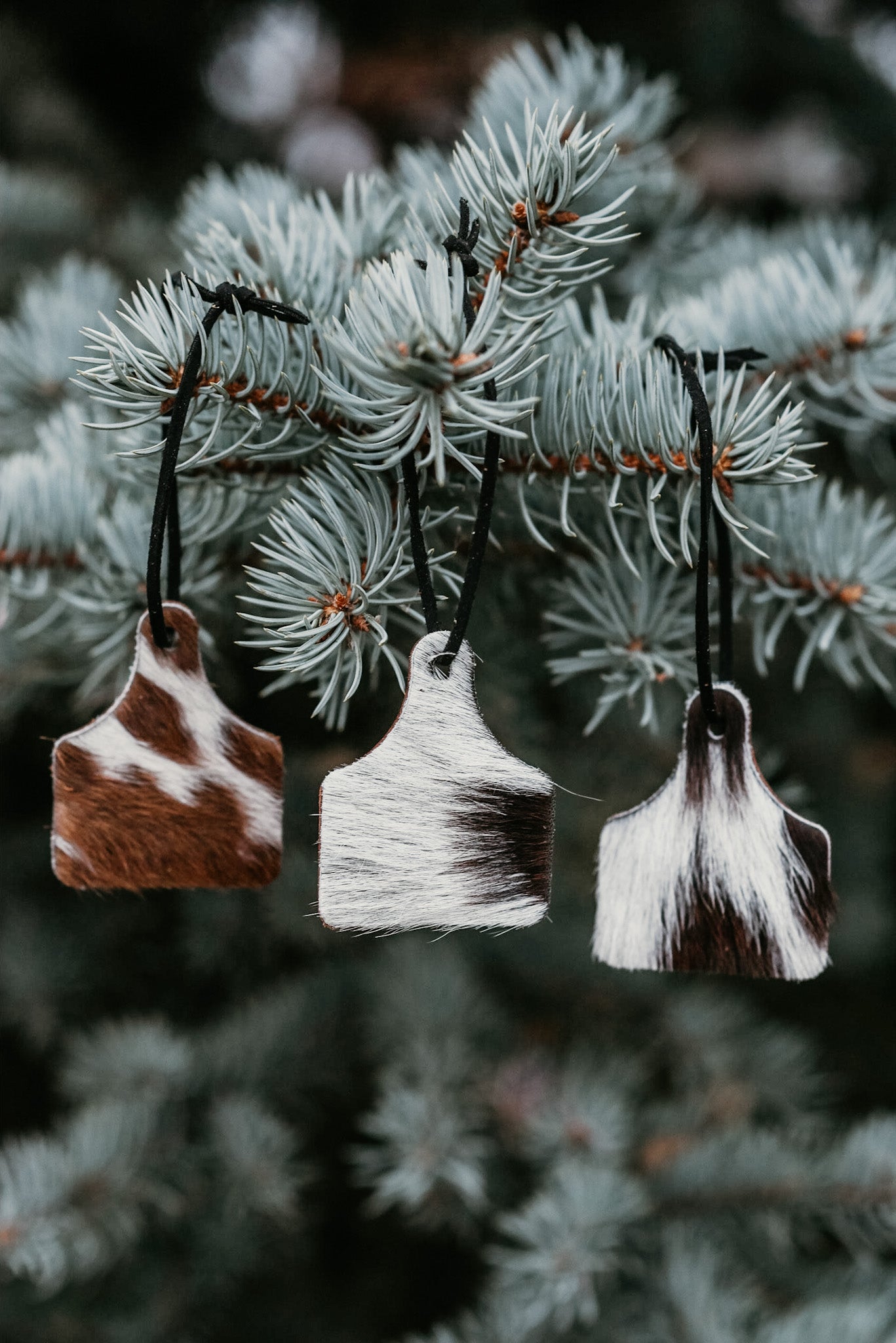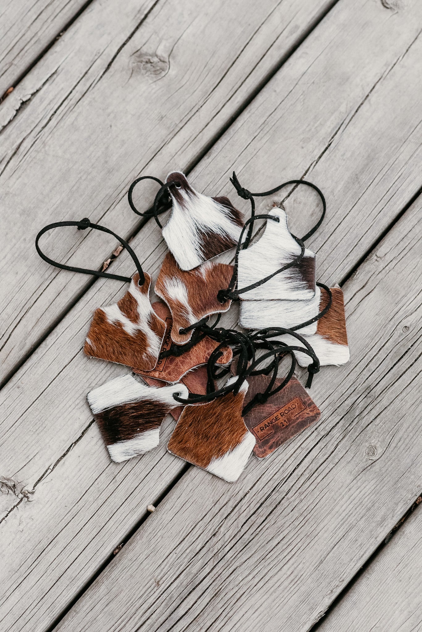 Hair on cowhide cow tag Christmas tree ornament for the rancher and western lovers! Made of genuine cowhide on the front and water buffalo leather on the back. Each ornament is very different and it’s a surprise for you what one you’ll get!
