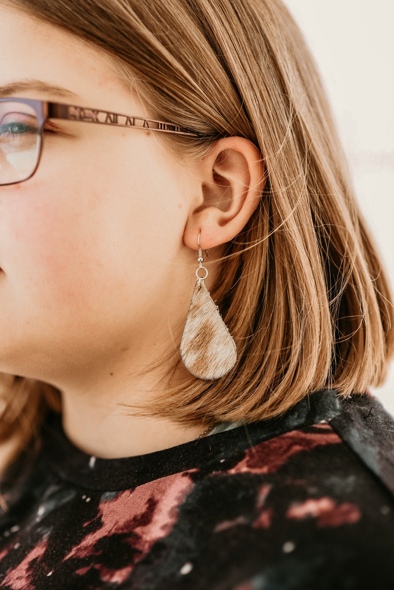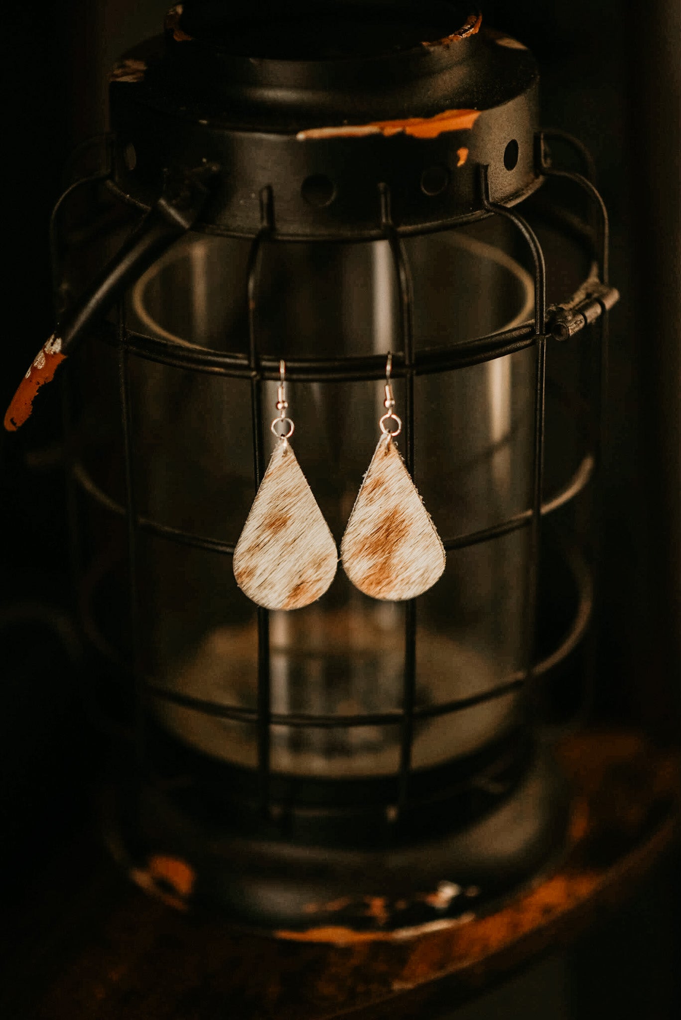 Dangle teardrop shape earrings made of brown and white speckled hair on cowhide.The hide is 2” long and a little over 1” wide at the widest part.