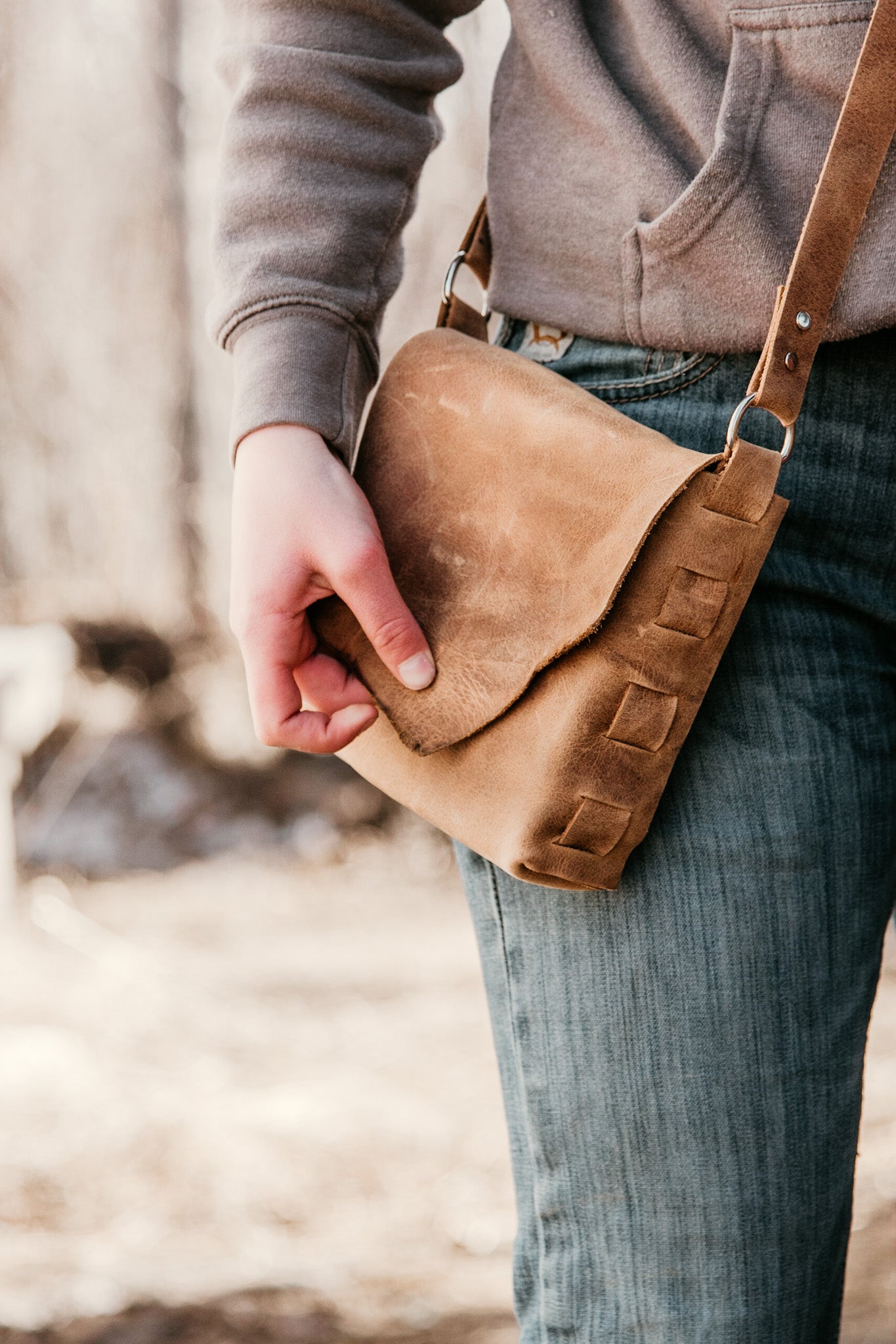 Woven side style brown leather handbag. 7” x 7” with a crossbody adjustable strap. Button closure. Double riveted strap and one big compartment inside.