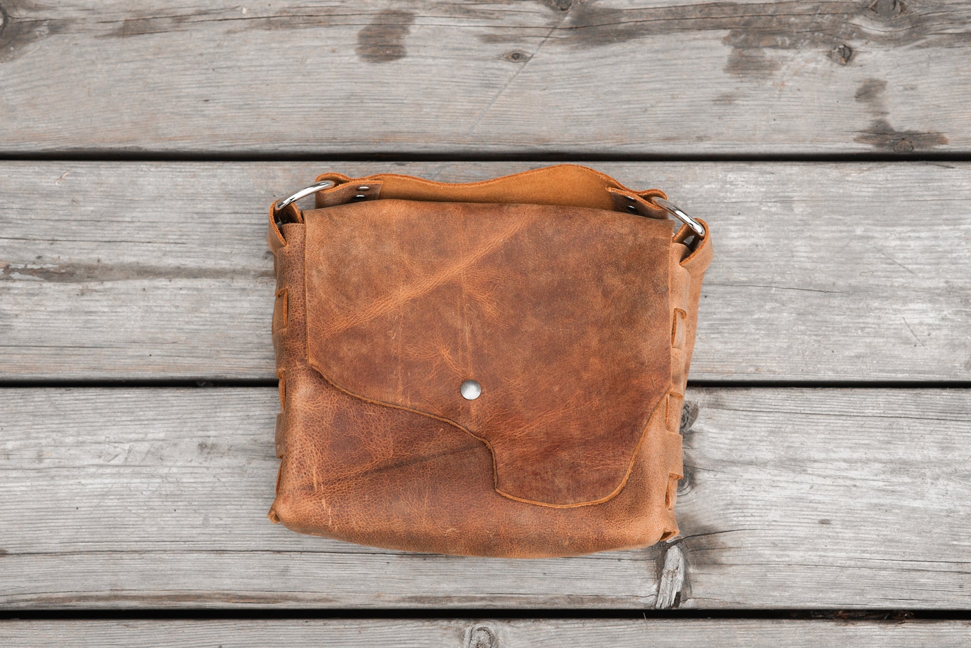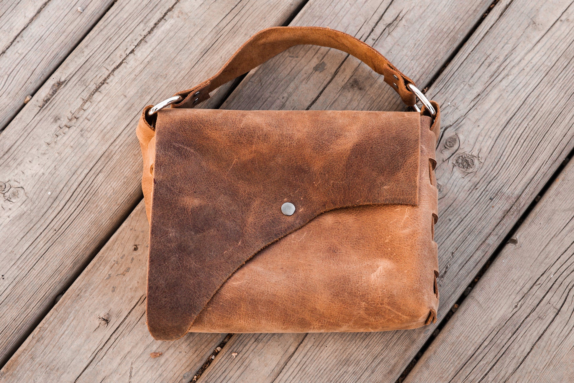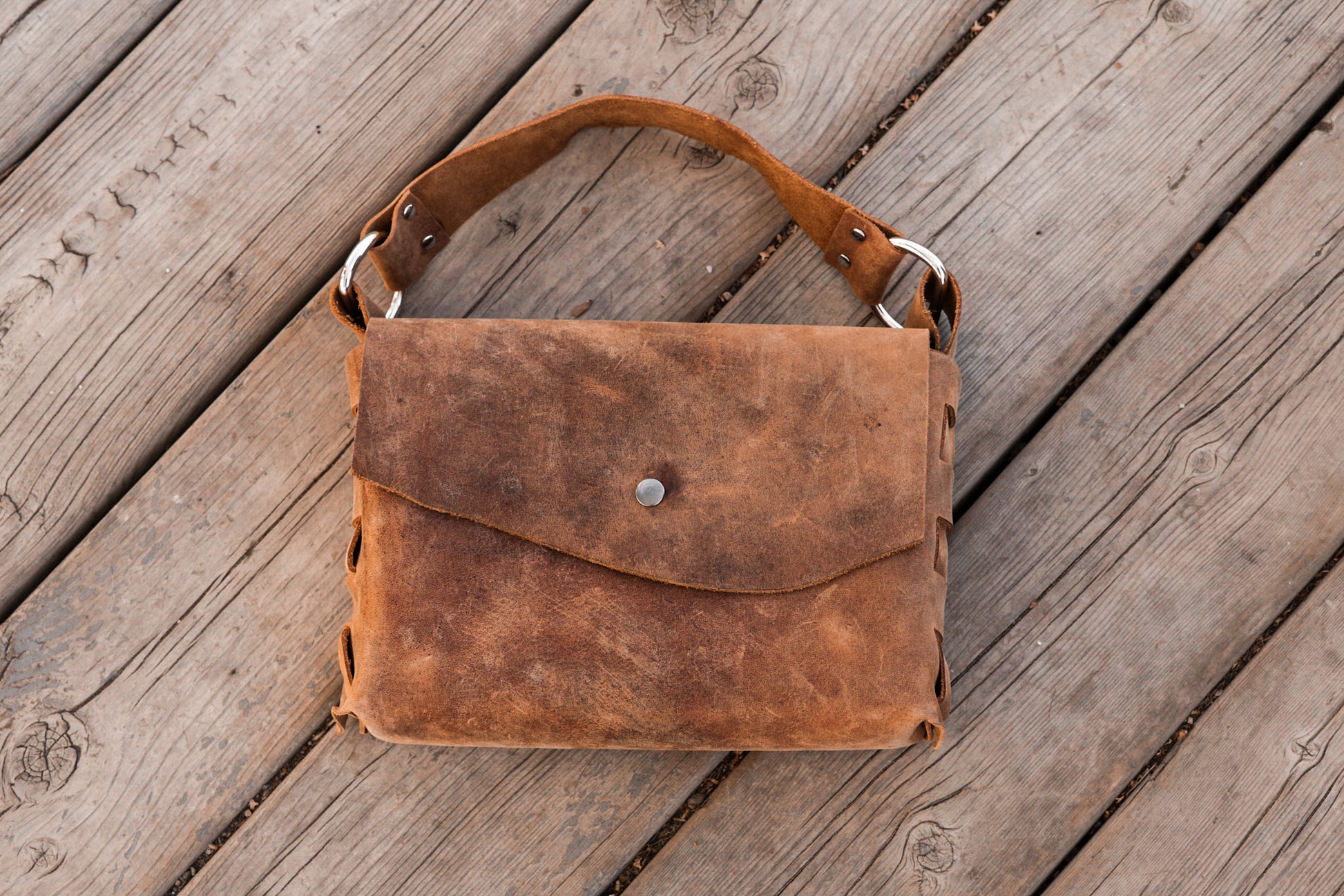 Our most popular bible bag, the Denver is made with brown rustic looking genuine leather and has a woven style side with a raw edge flap and snap closure.