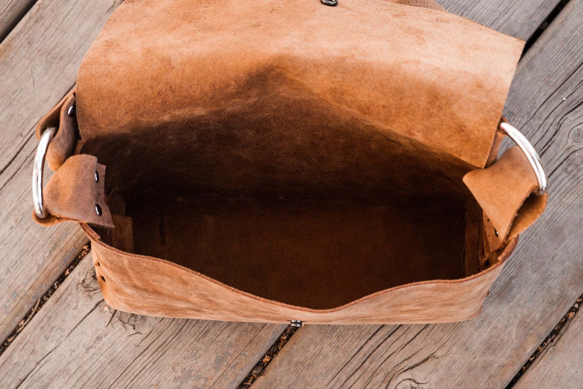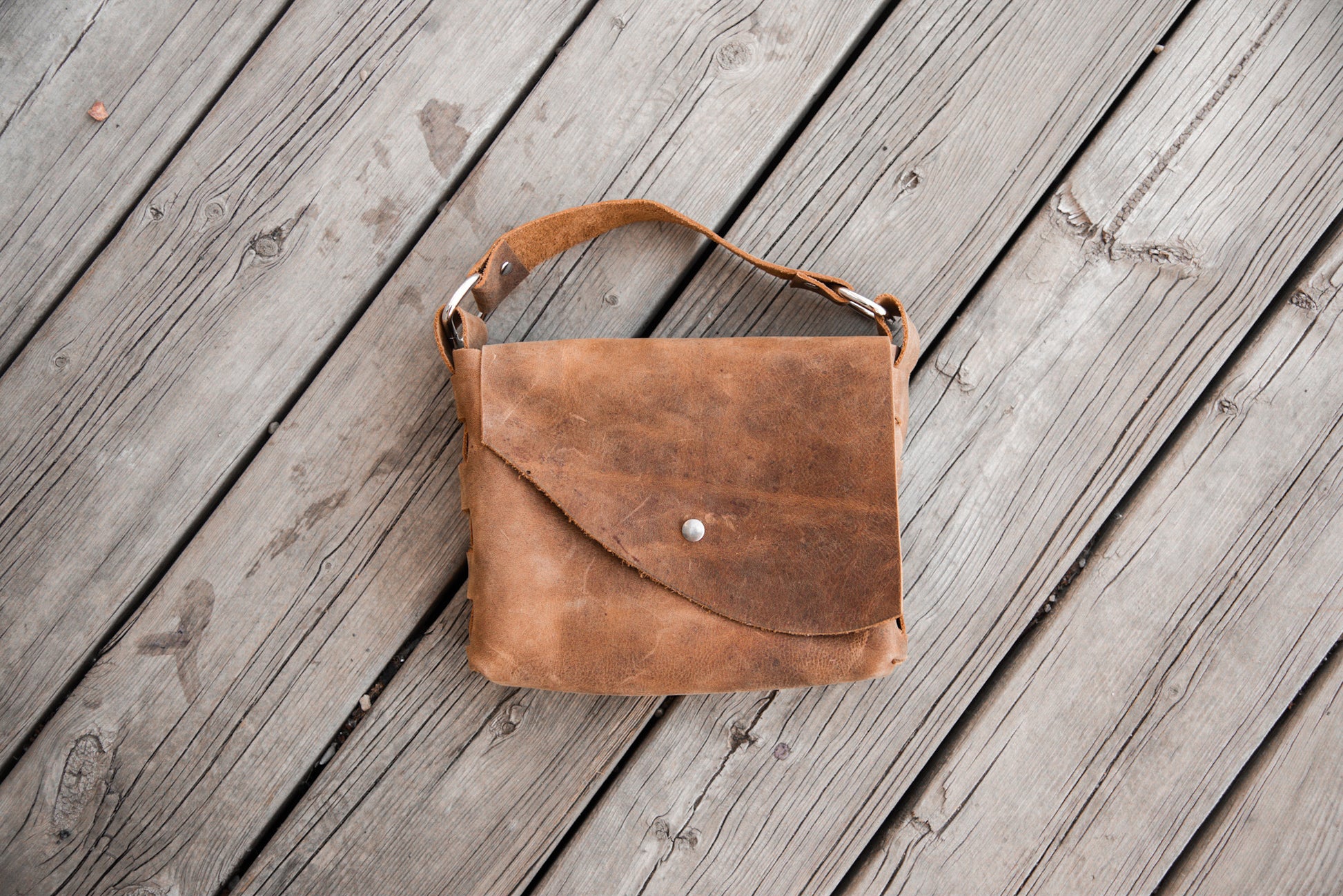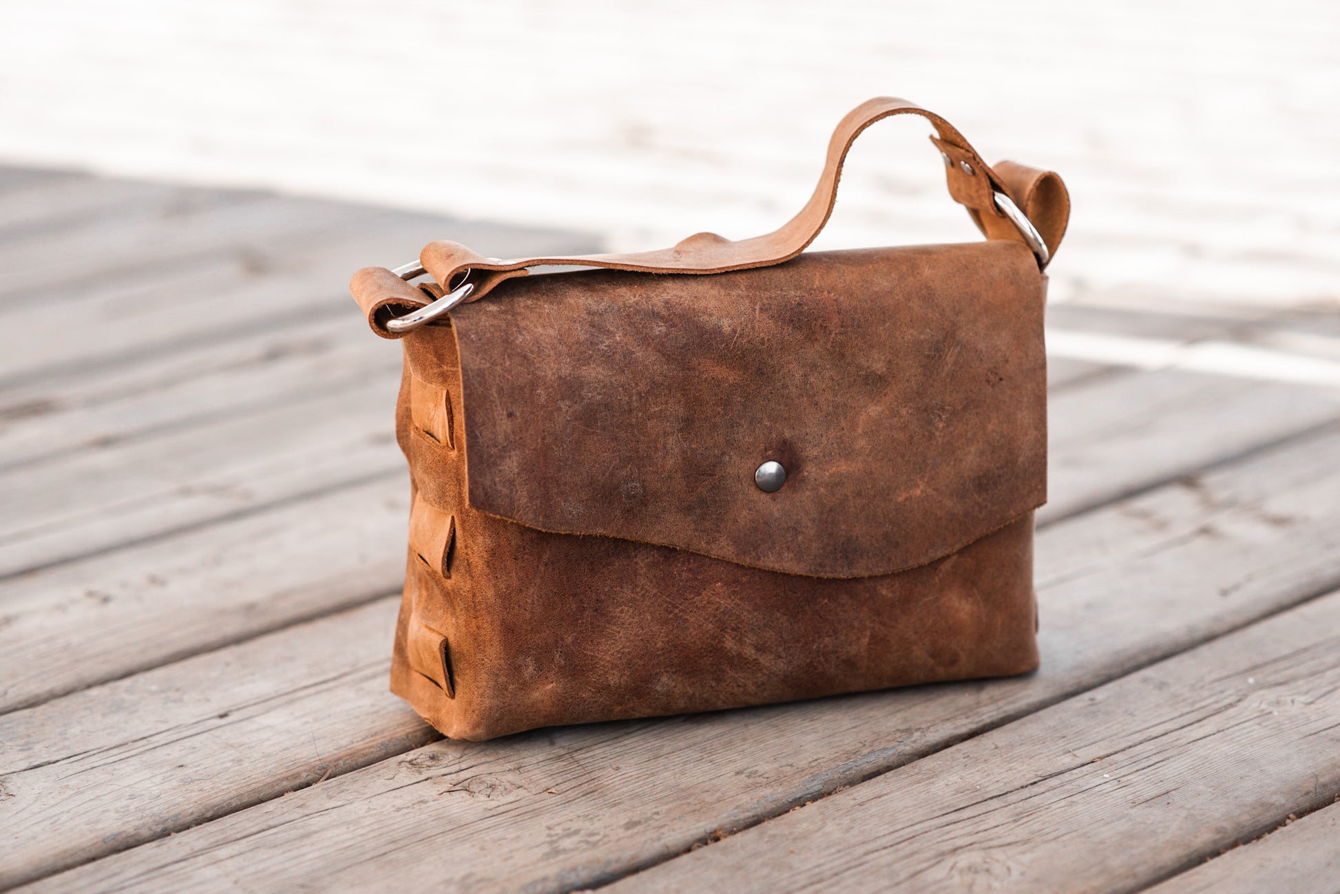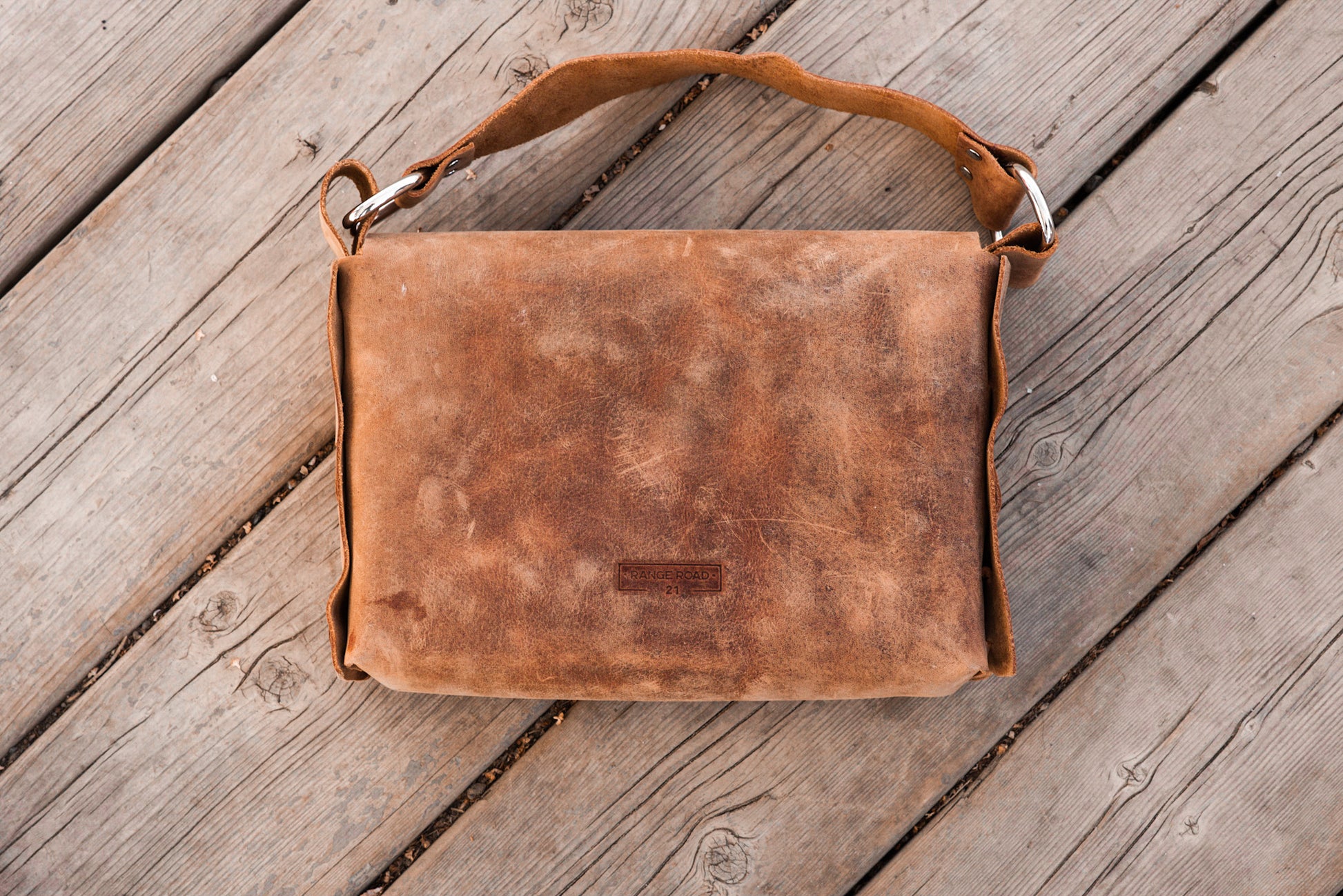 Our most popular bible bag, the Denver is made with brown rustic looking genuine leather and has a woven style side with a raw edge flap and snap closure.