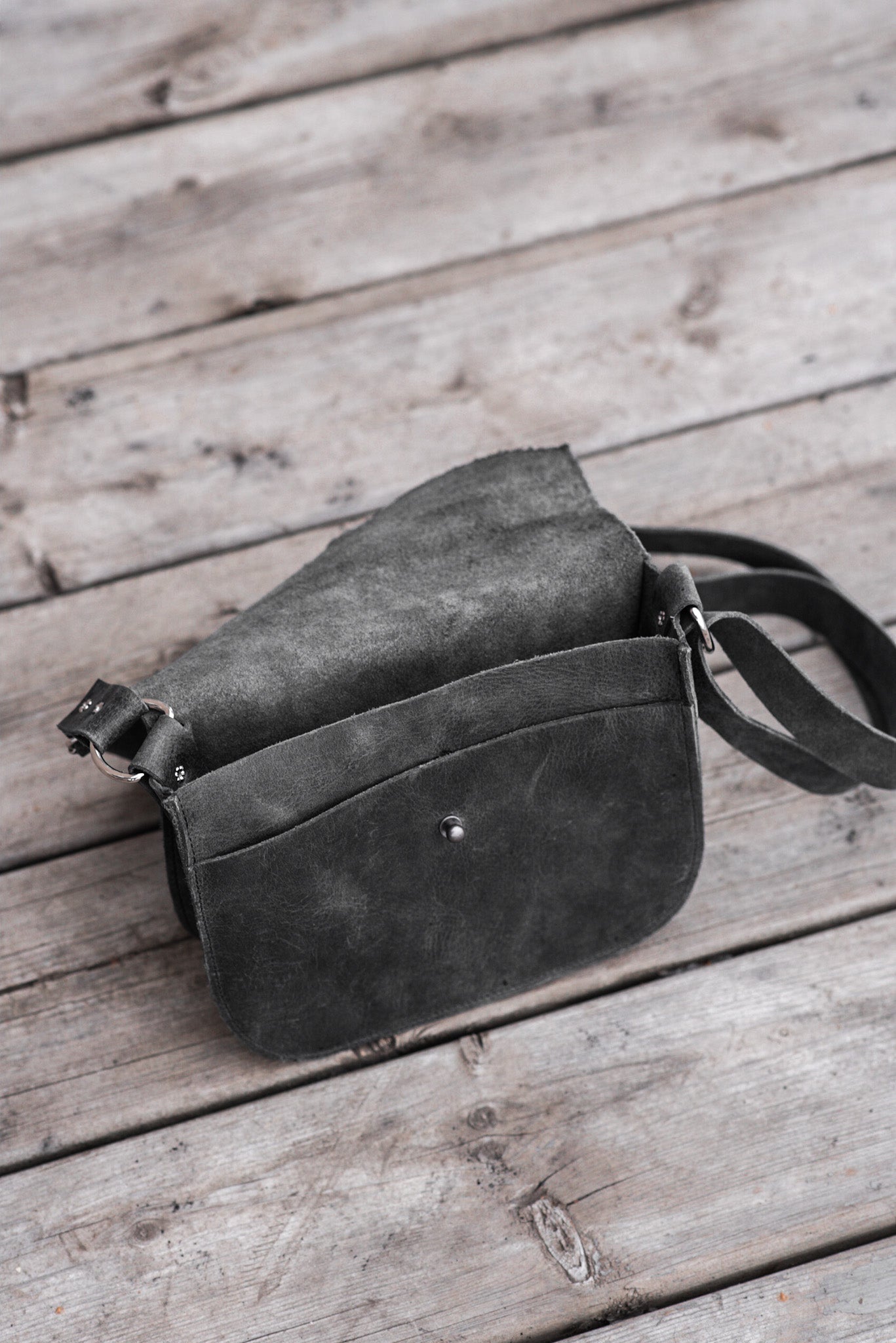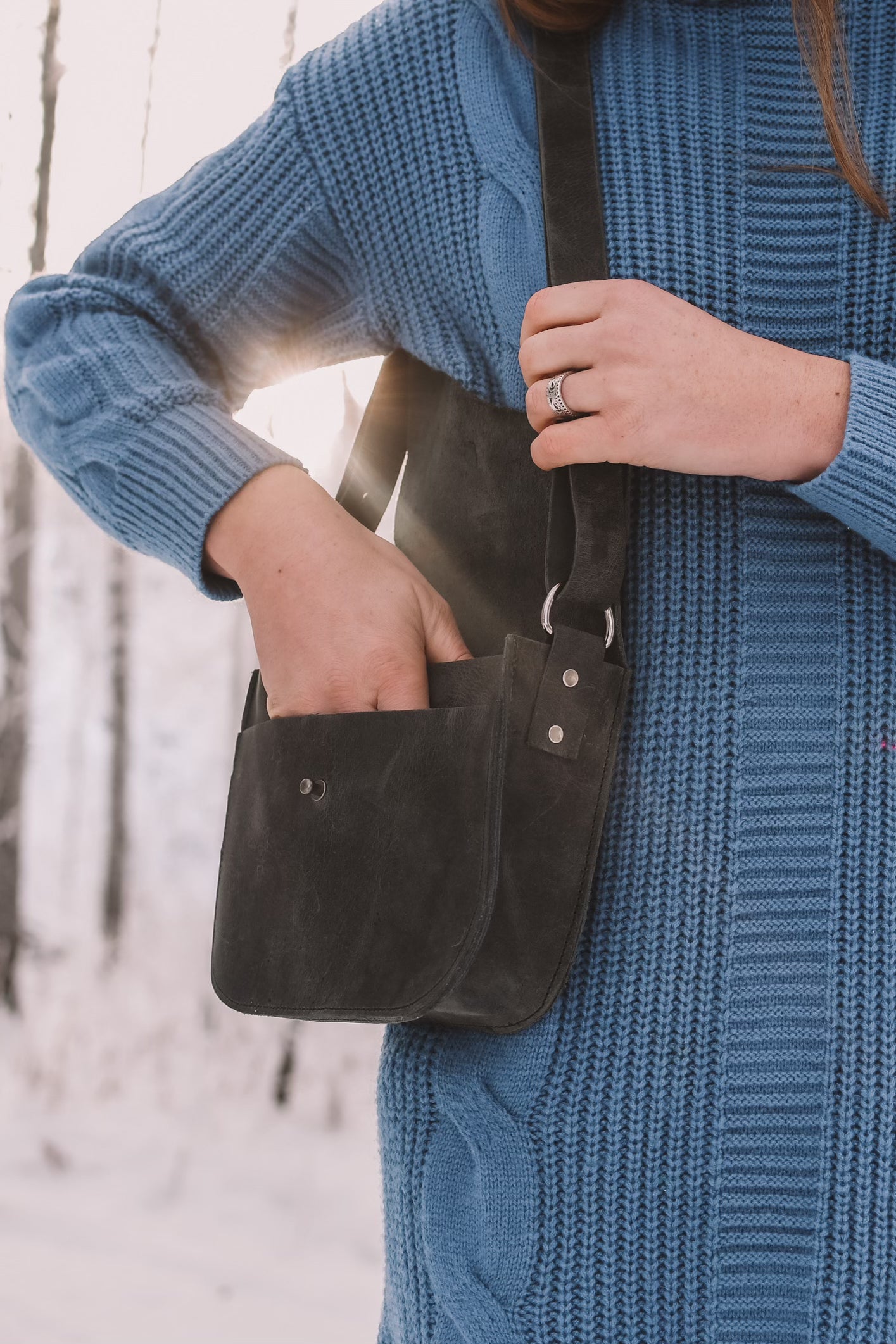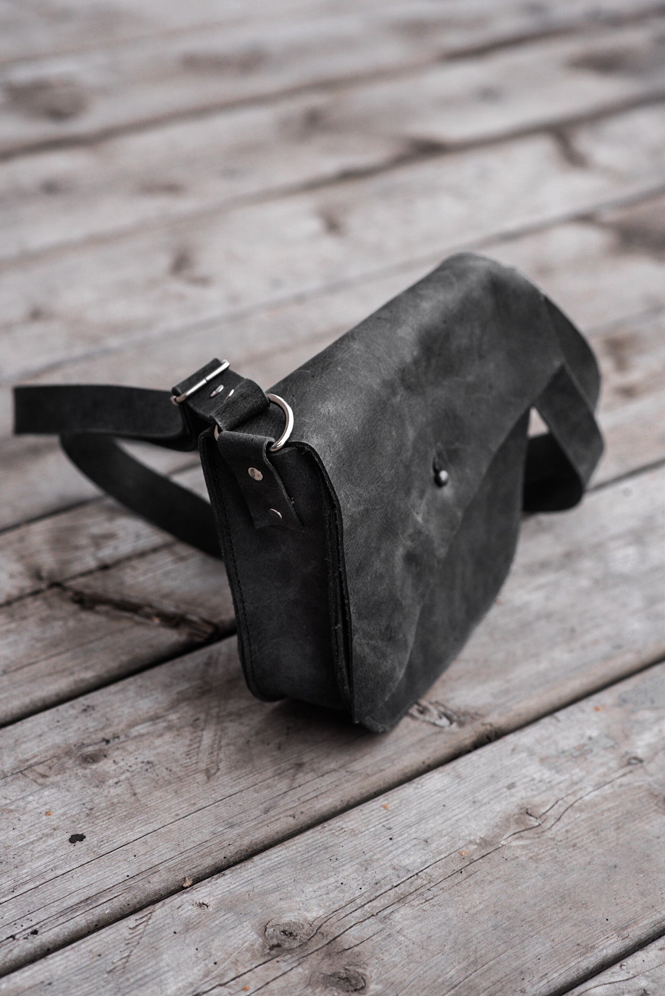 Made with black soft rustic style genuine water buffalo hide, this bag is approximately 8” x 6” x 2.5”.