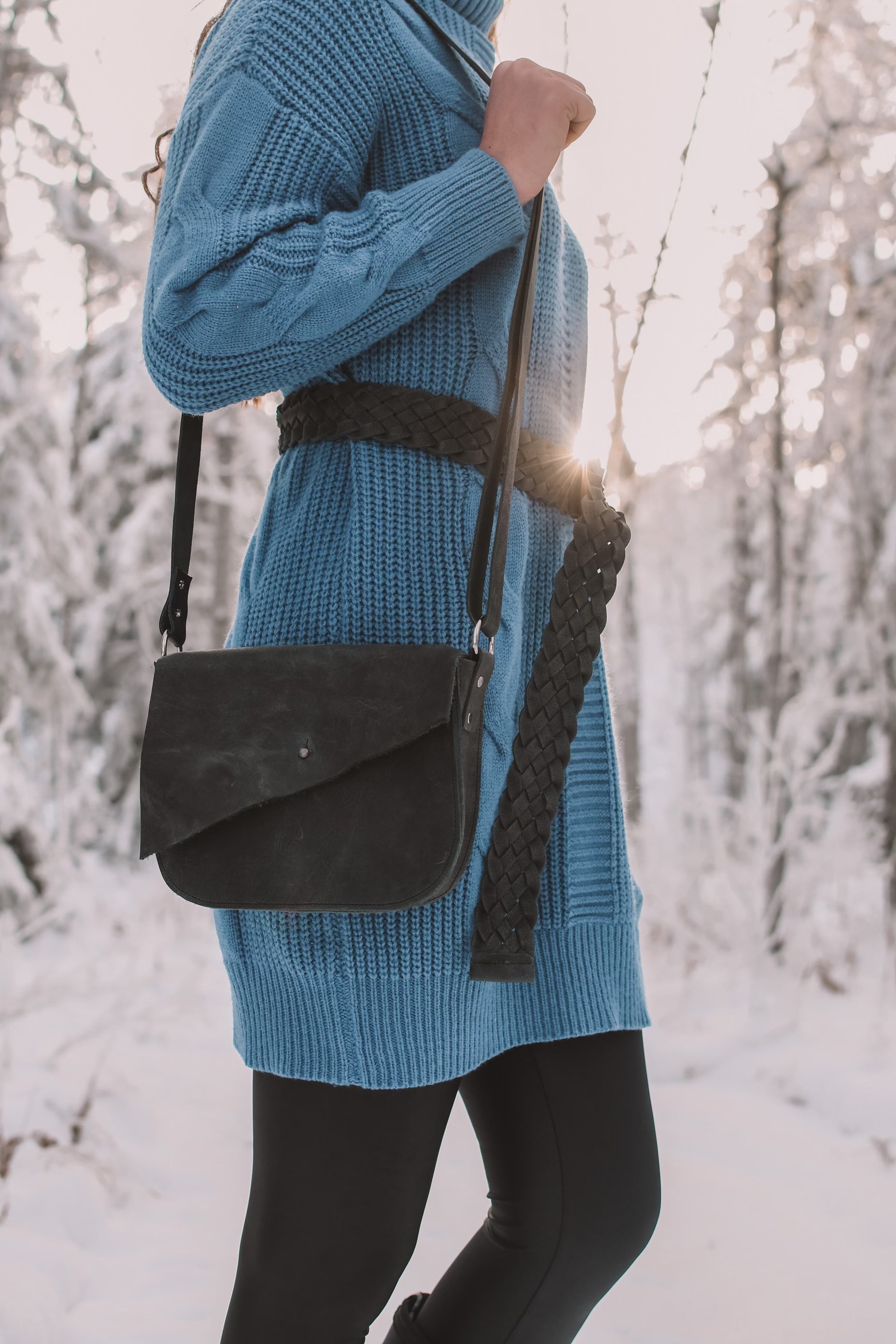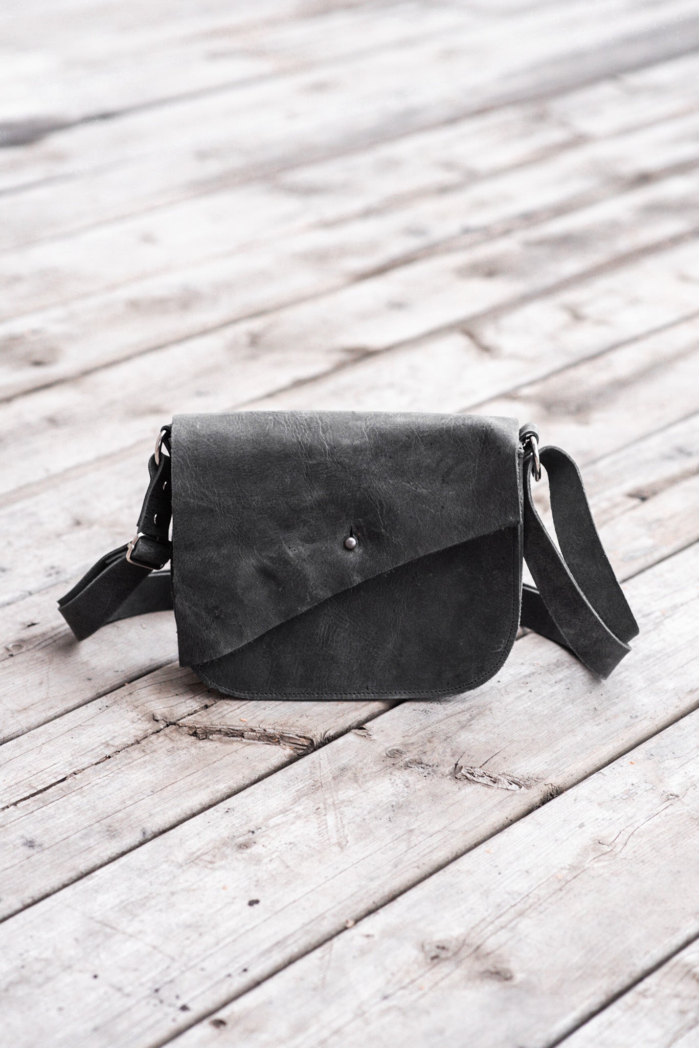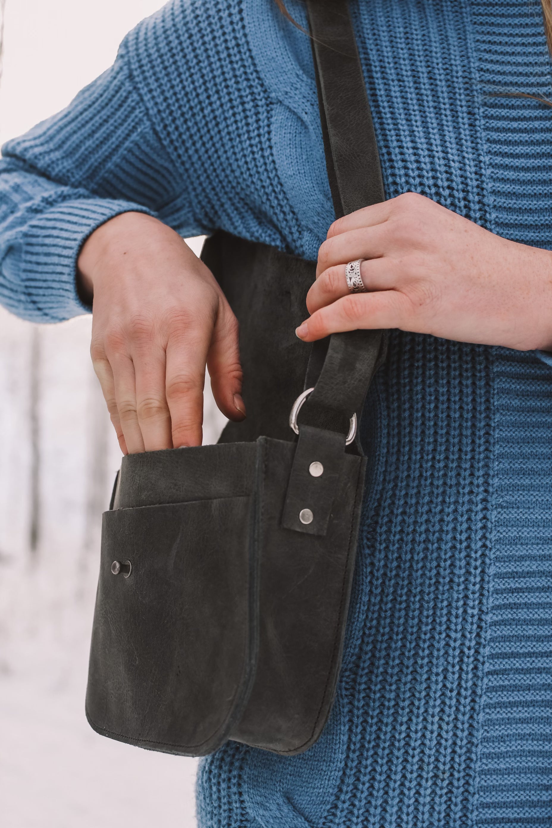 Made with black soft rustic style genuine water buffalo hide, this bag is approximately 8” x 6” x 2.5”.