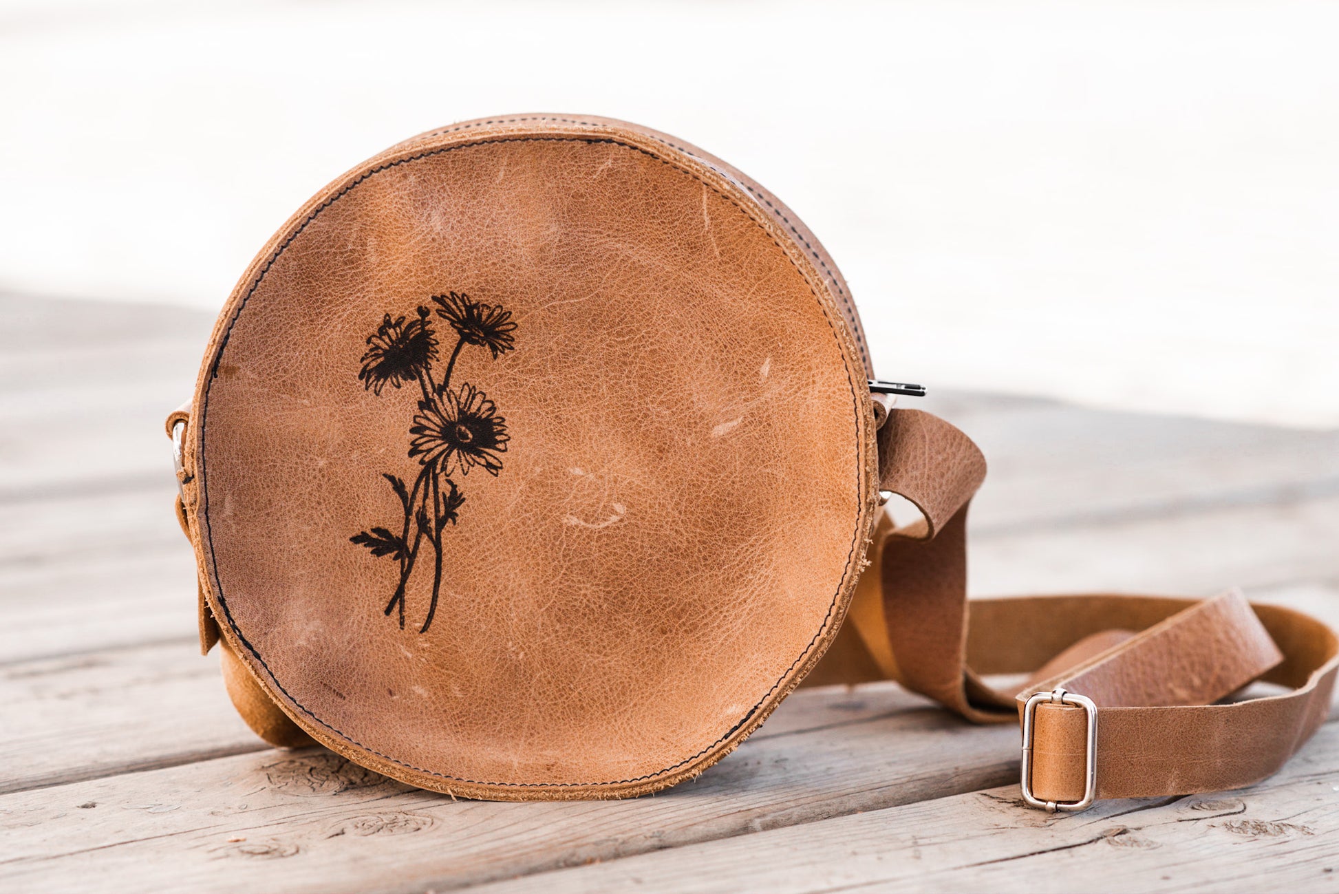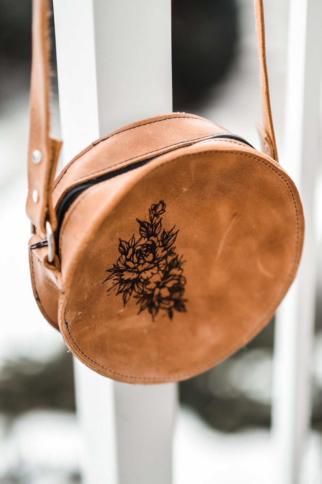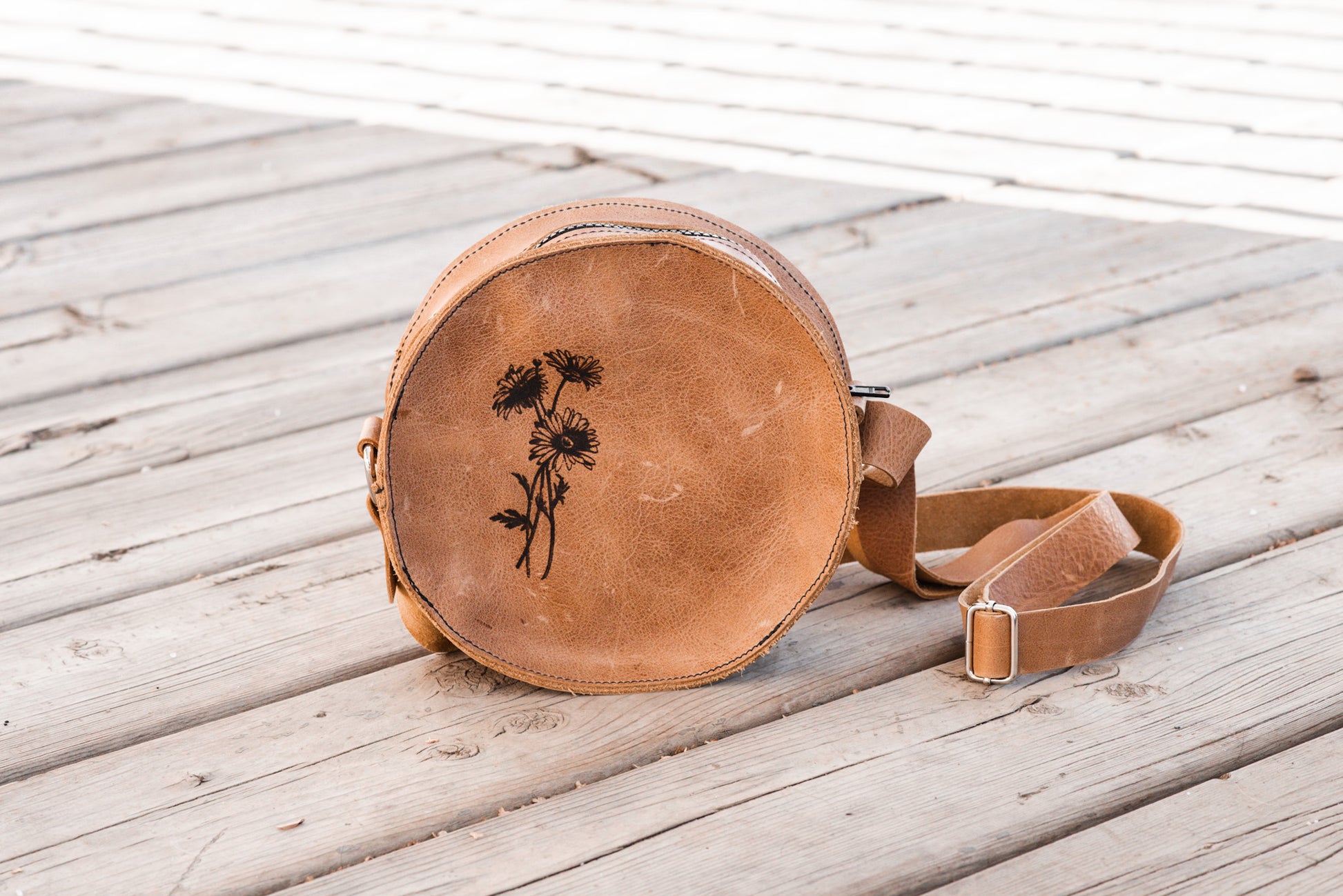 Floral engraved circle purse made with tan soft texture leather. Diameter across the bag is approximately 7.5”. 2.5” wide with a zipper closure. Soft leather shoulder strap 23” to the top of the bag.