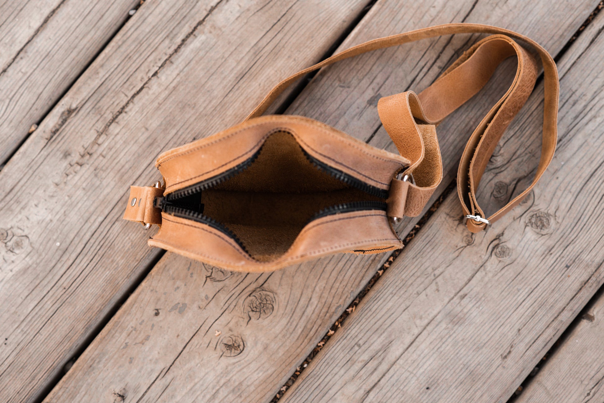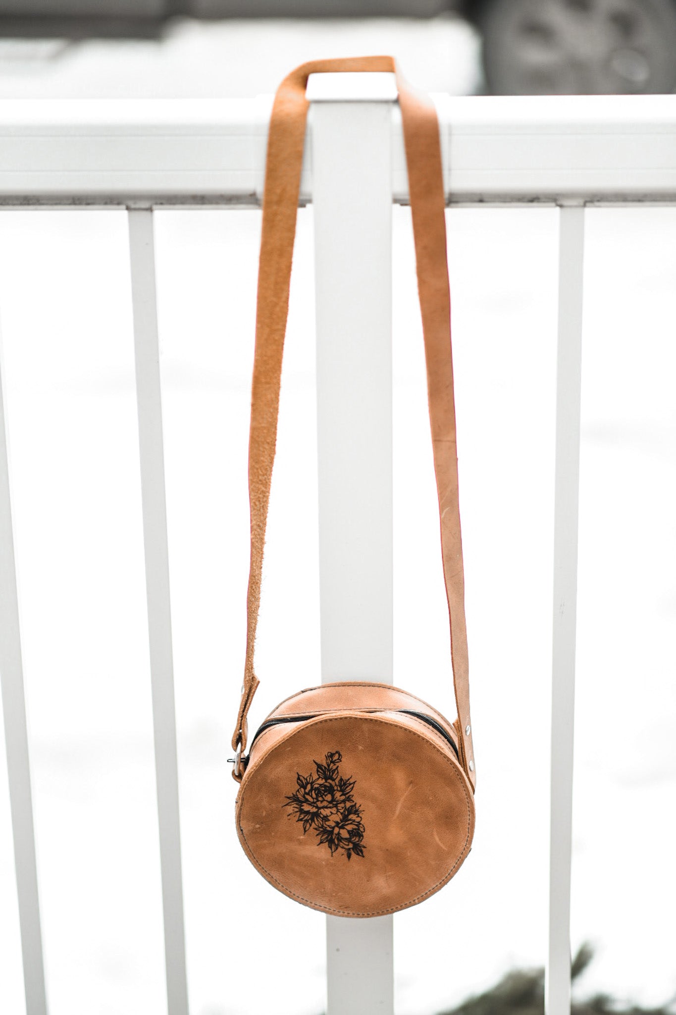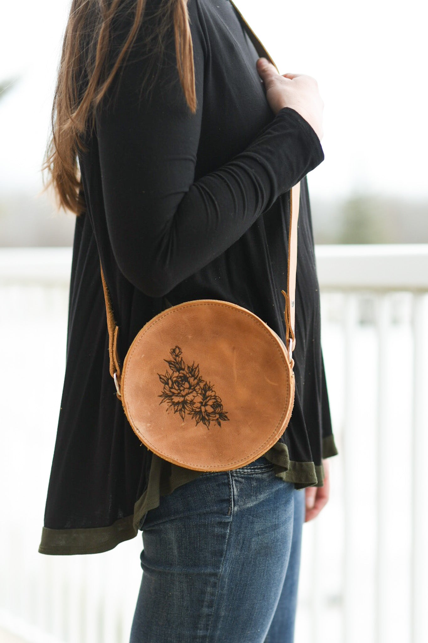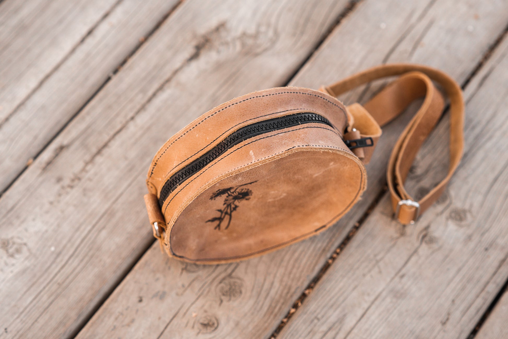 Floral engraved circle purse made with tan soft texture leather. Diameter across the bag is approximately 7.5”. 2.5” wide with a zipper closure. Soft leather shoulder strap 23” to the top of the bag.