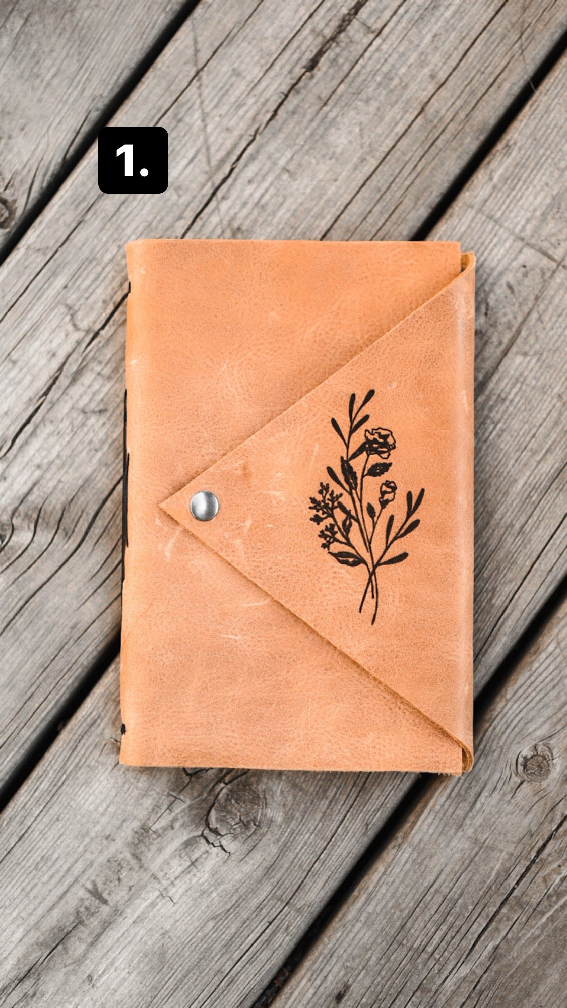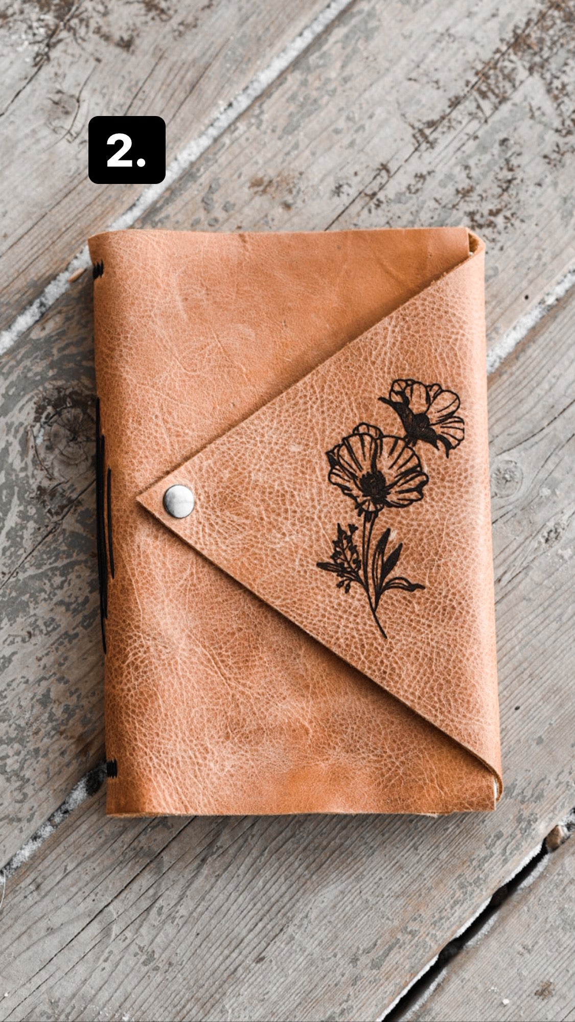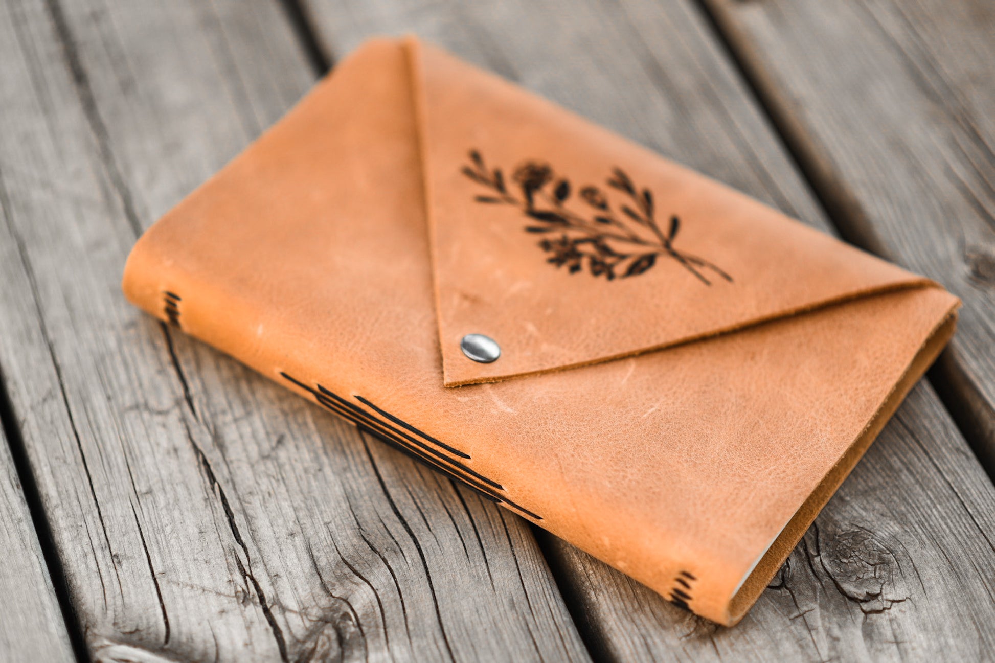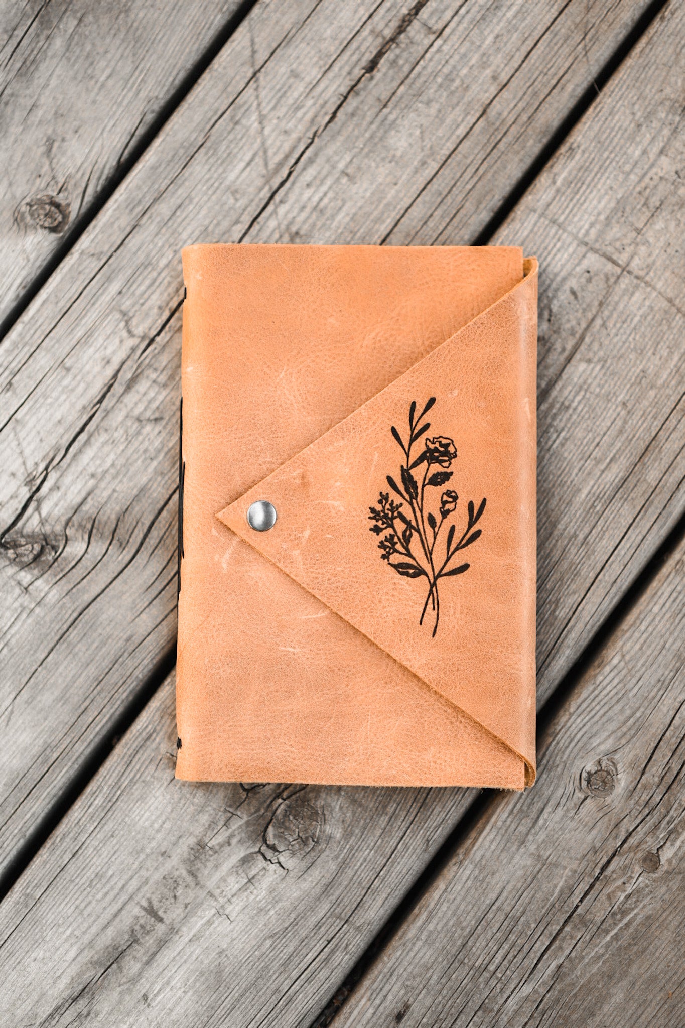 Floral engraved tan distressed leather journal with snap closure. Approximately 9” tall x 6” wide with 120 lined pages. Geometric style stitching for the binding.