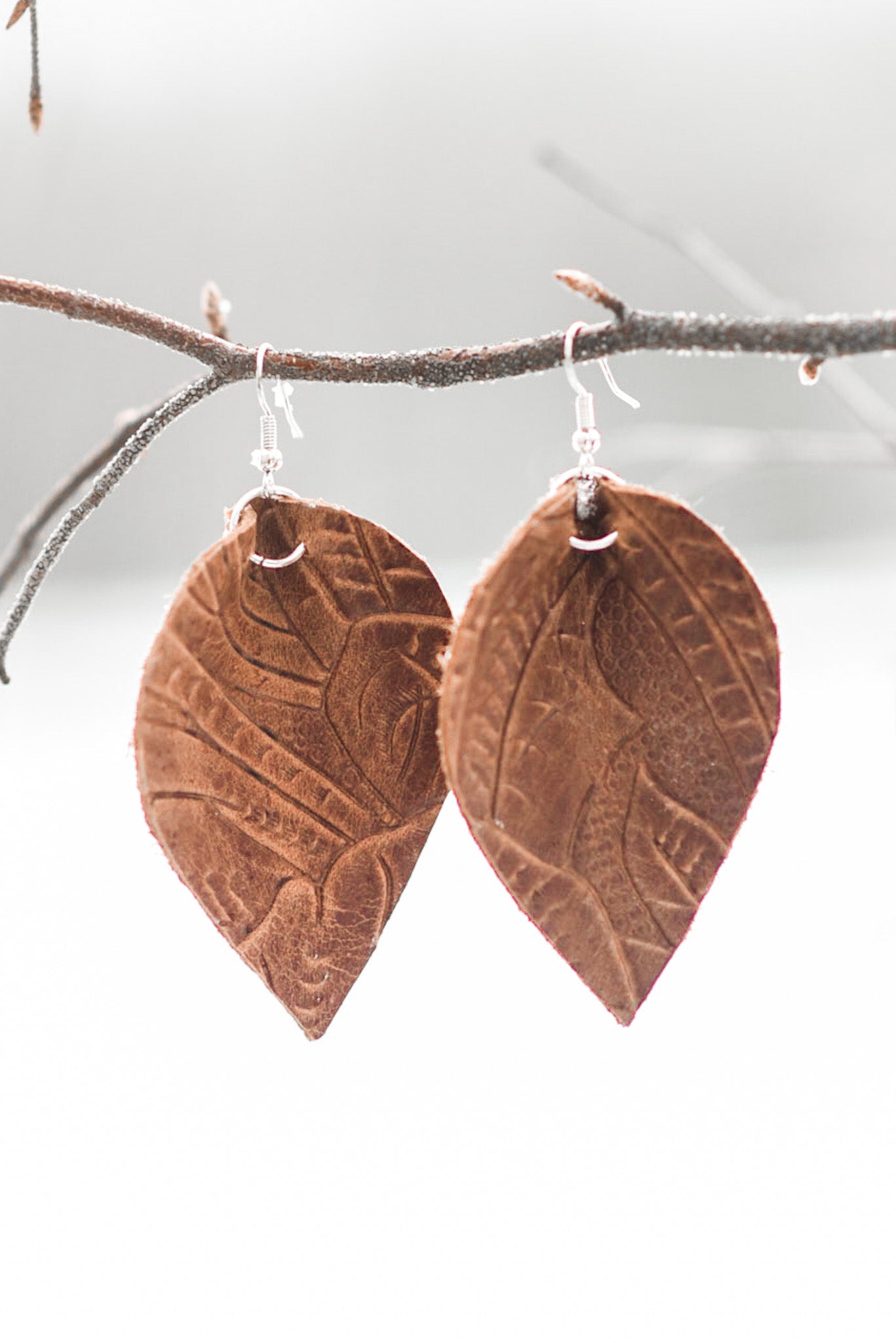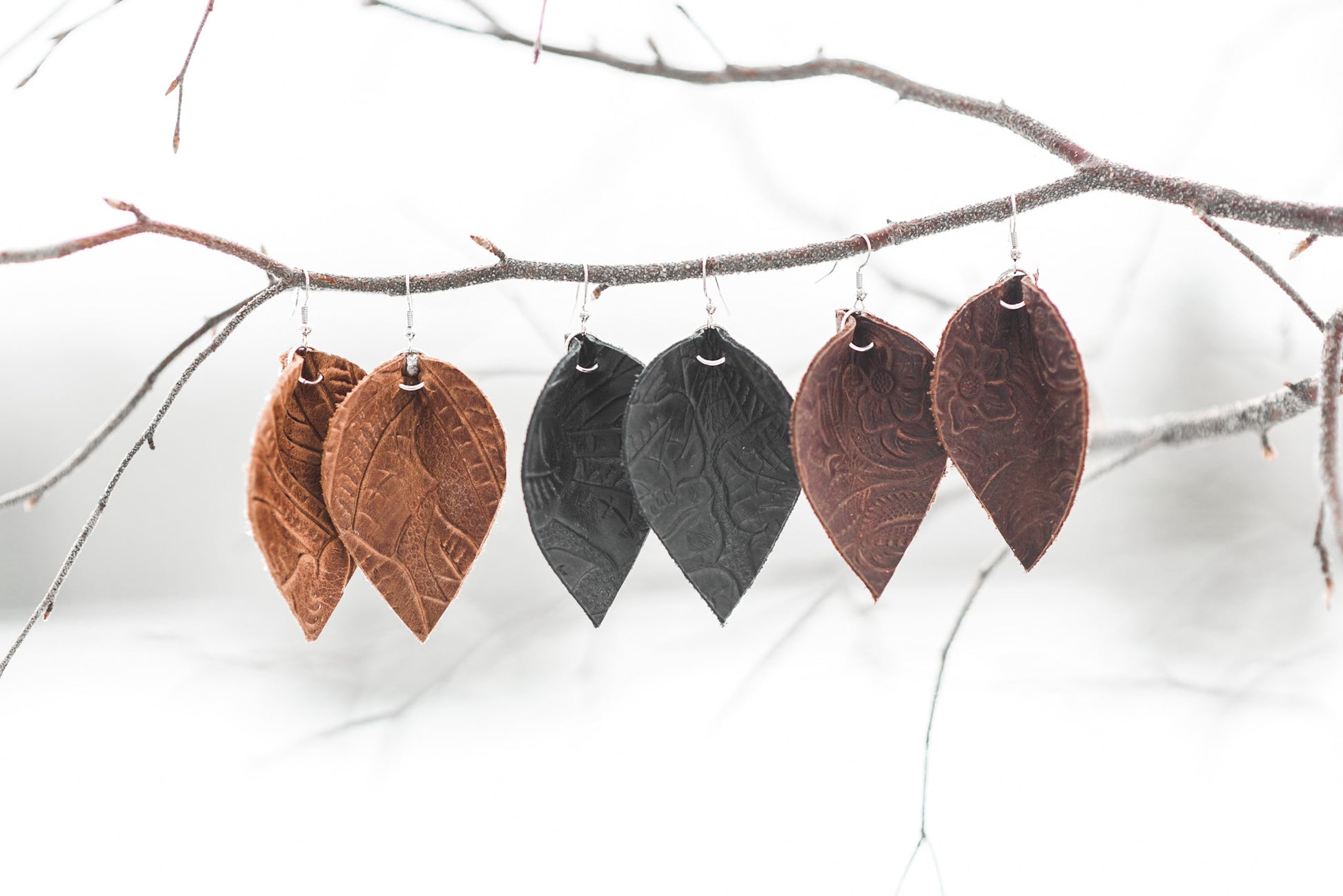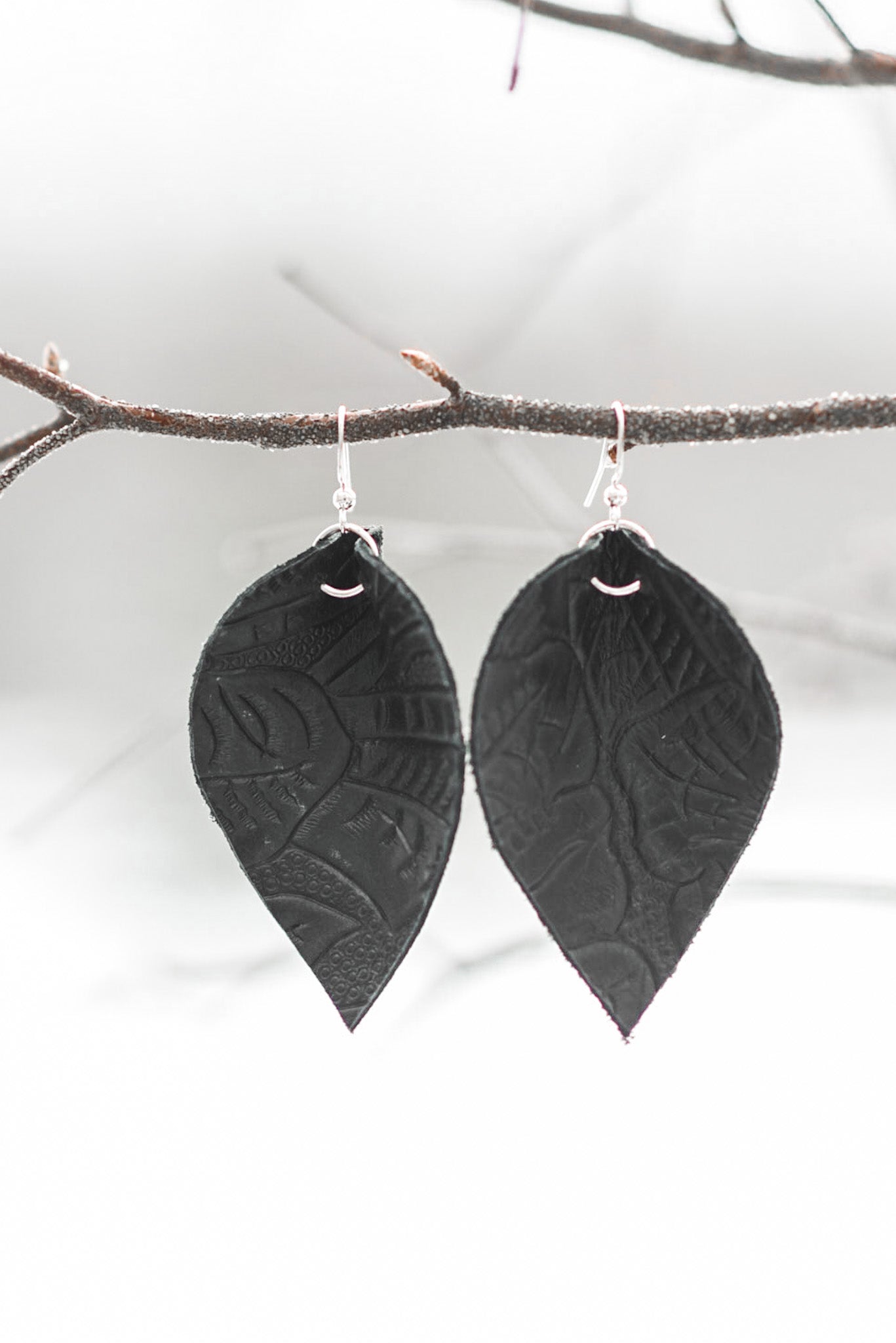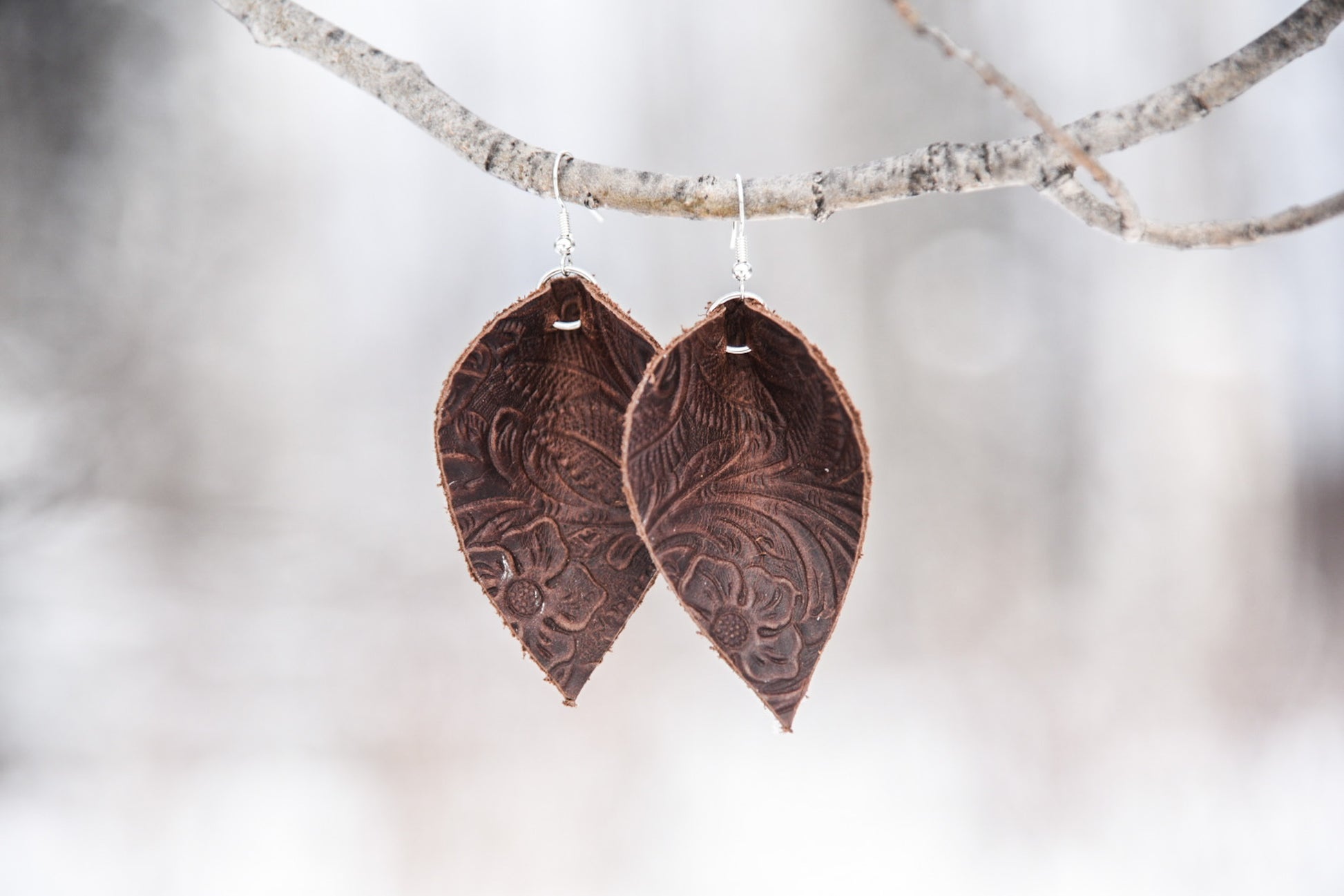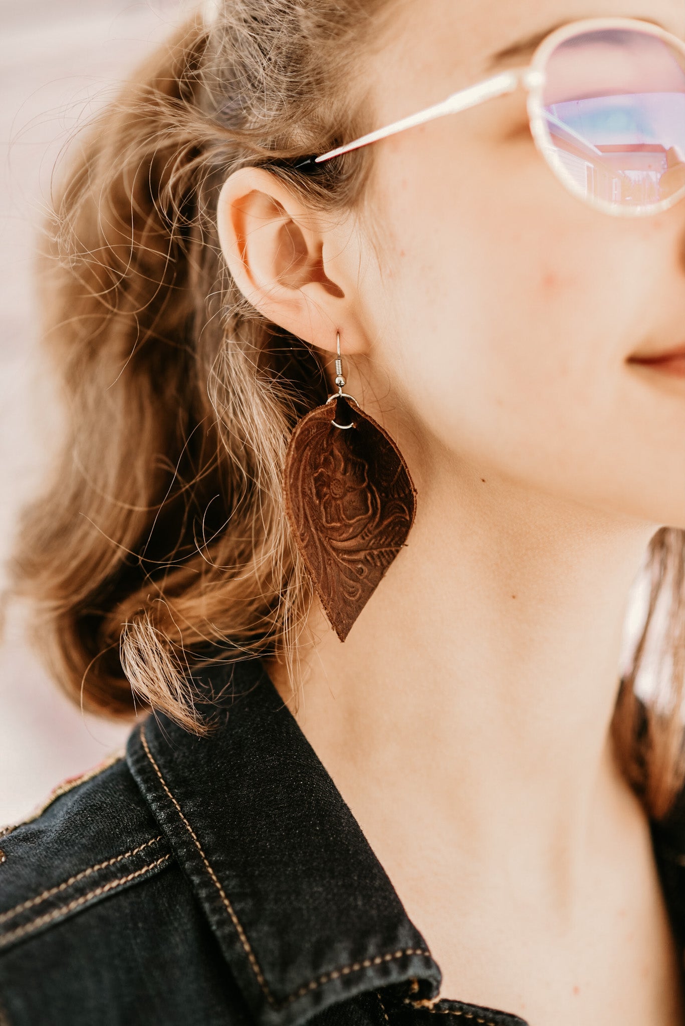 Textured leather with floral embossing. The teardrop is roughly 2.5” long plus the earring hook and not quite 2” wide. These earrings are perfect if you want to be a little extra without being super bold about it!