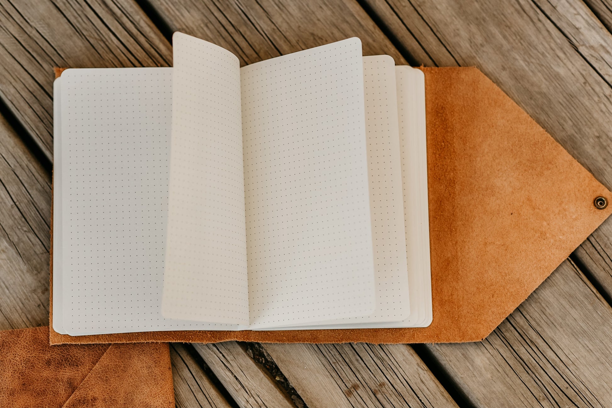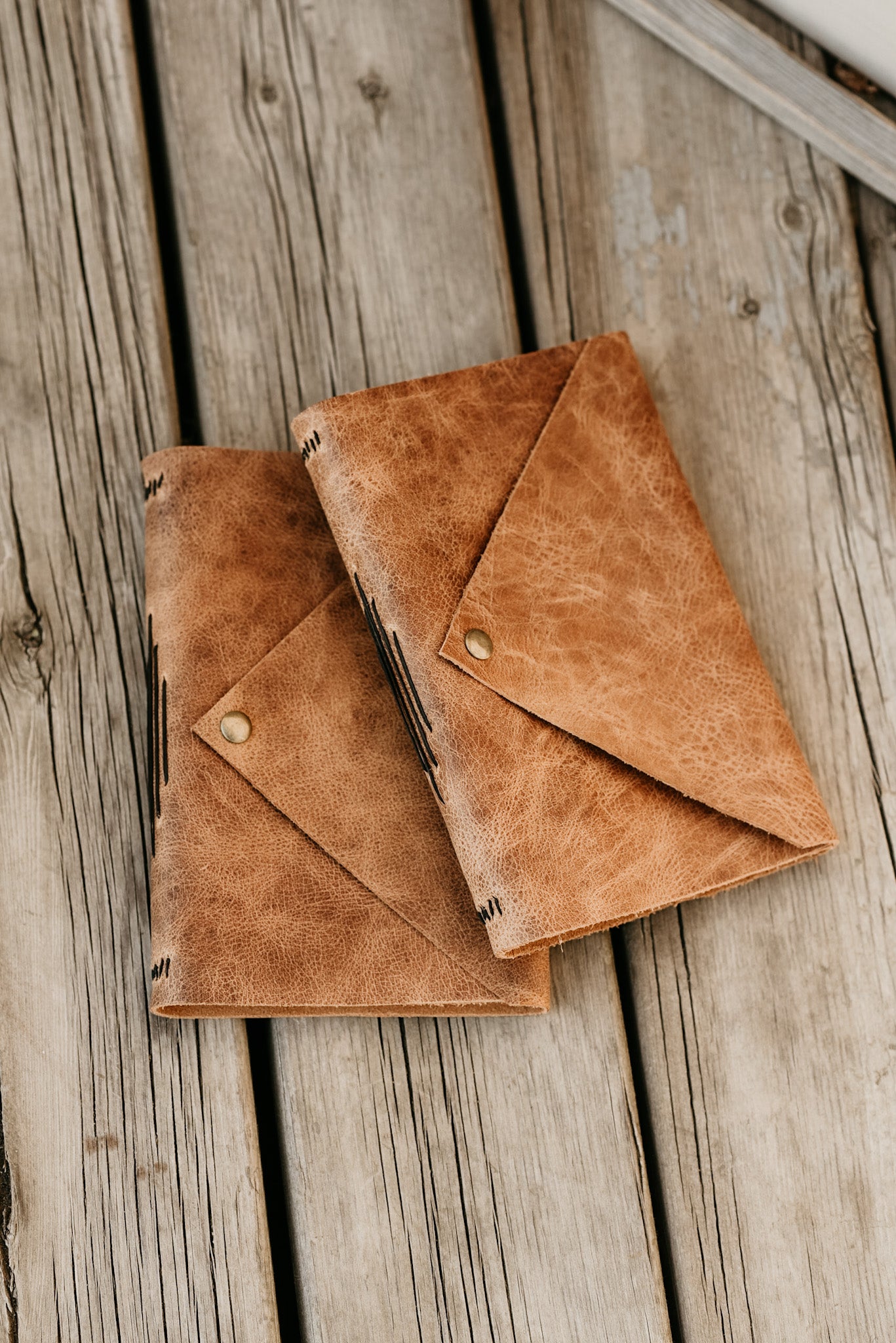 Rustic brown distressed gardener or flower farmer’s leather journal. Made with genuine water buffalo hide. V Shape flap with snap style closure. Approximately 9” tall x 6” wide with 120 dot pages. Geometric style stitching for the binding.