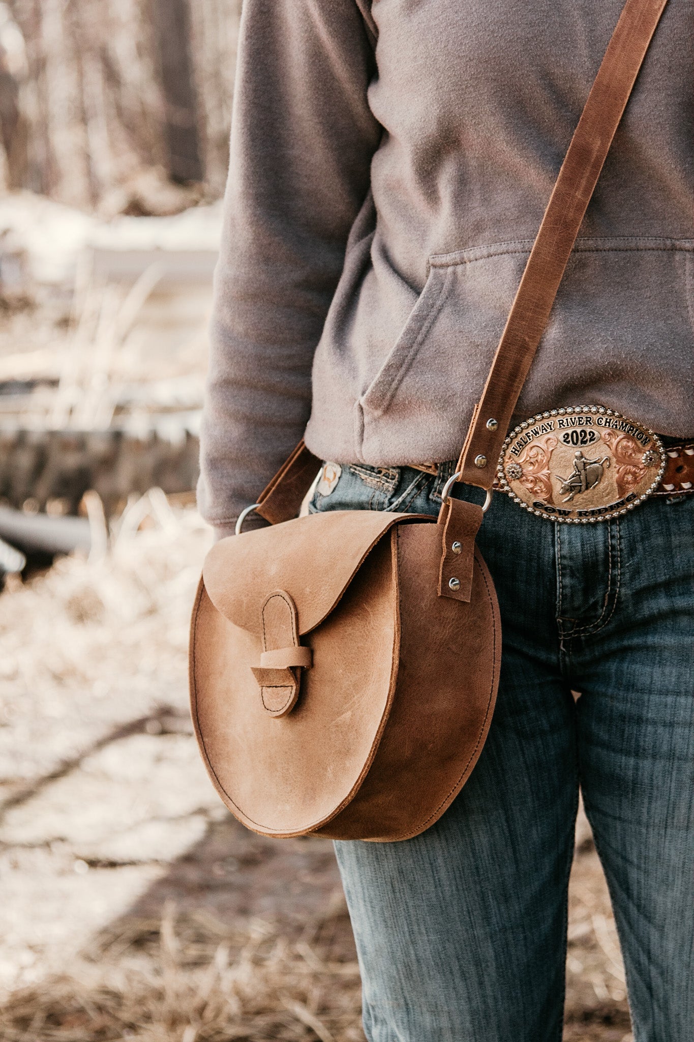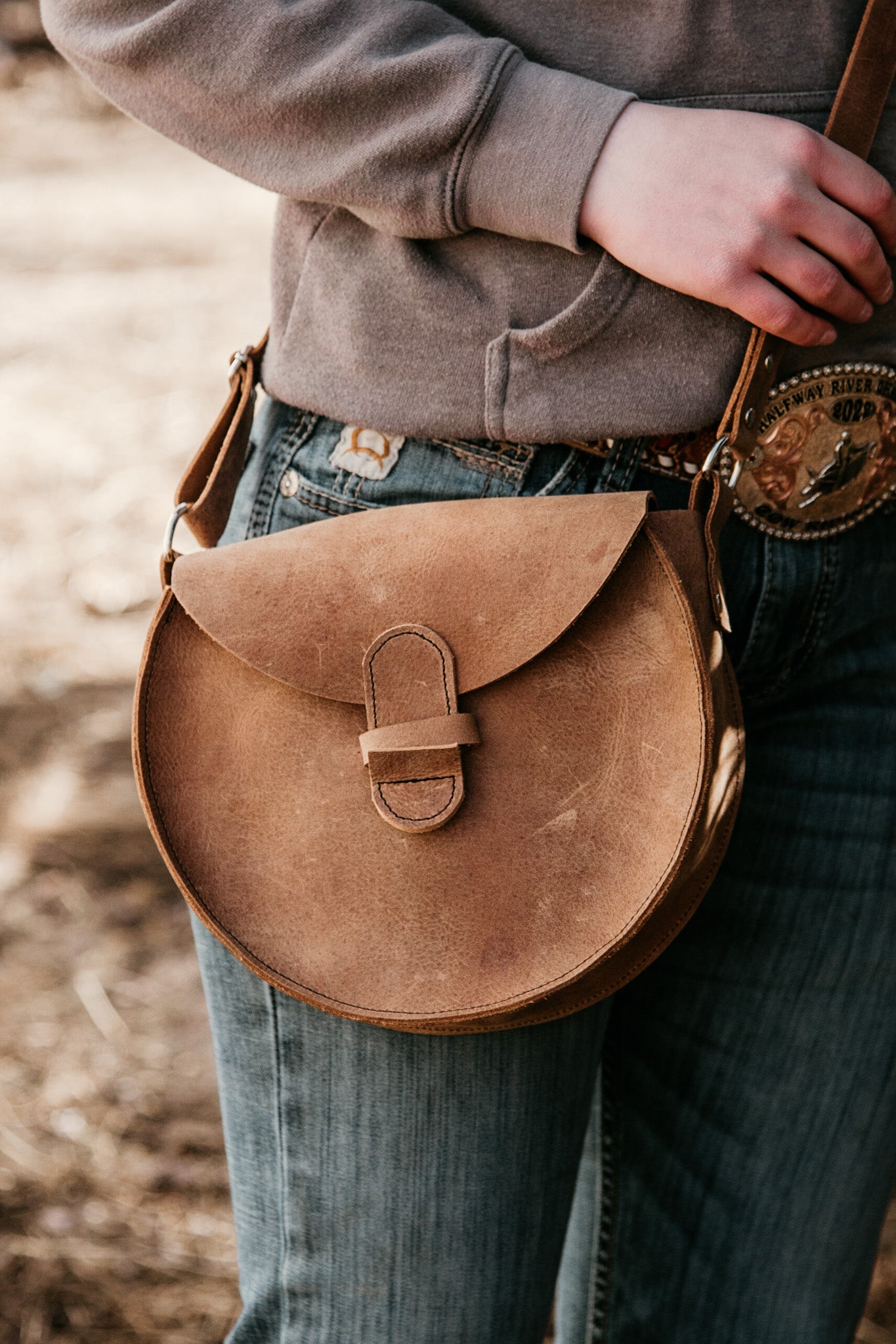 10” across by 9” tall, 3” wide. This 3/4 circle handbag is made with brown genuine leather. one big compartment inside with a slip q style closure. The tan has a leather lip that catches the little strap to keep it closed! Made with an adjustable cross body strap and double riveted.