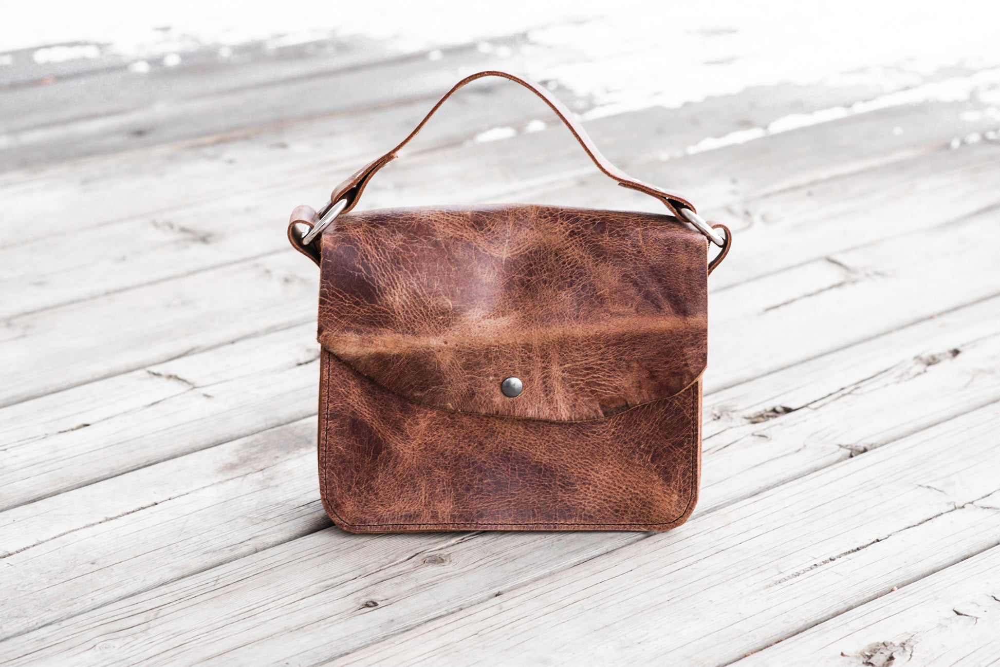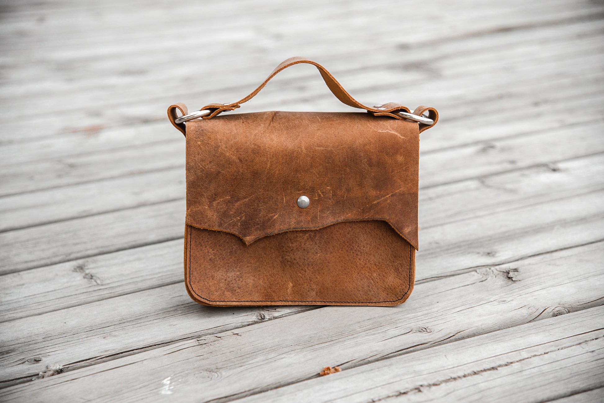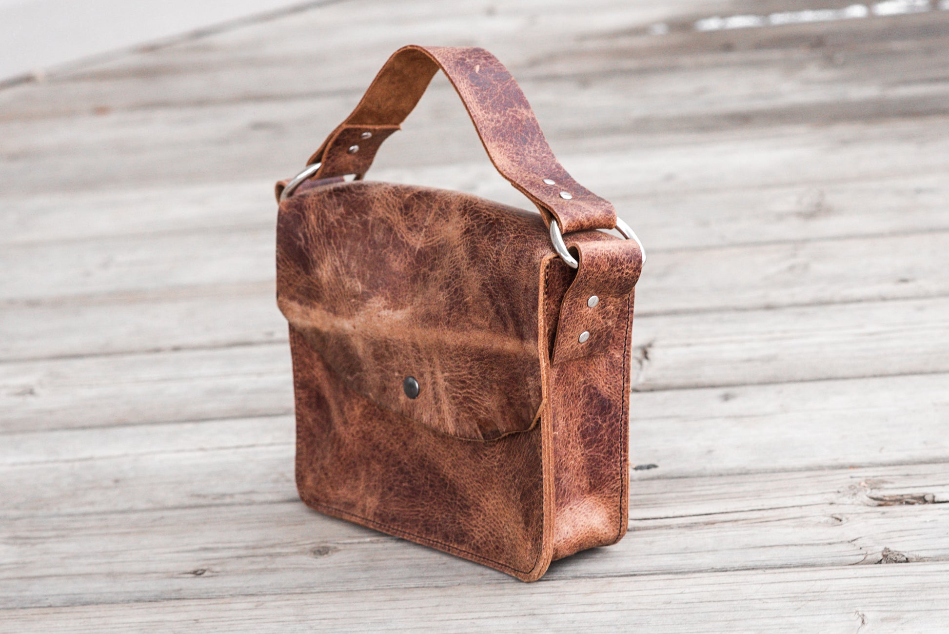 Approximately 9” long, 7” tall and 2.5” wide with one big compartment inside and a pocket on the front under the flap, with or without a glued and riveted short handle that is about 12” total leather length.