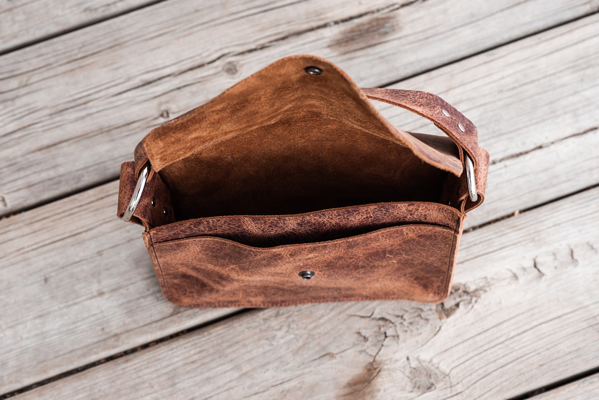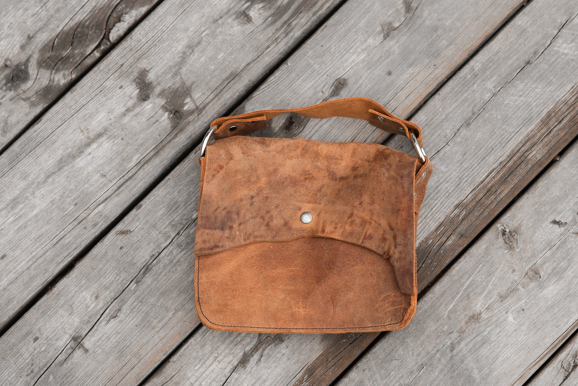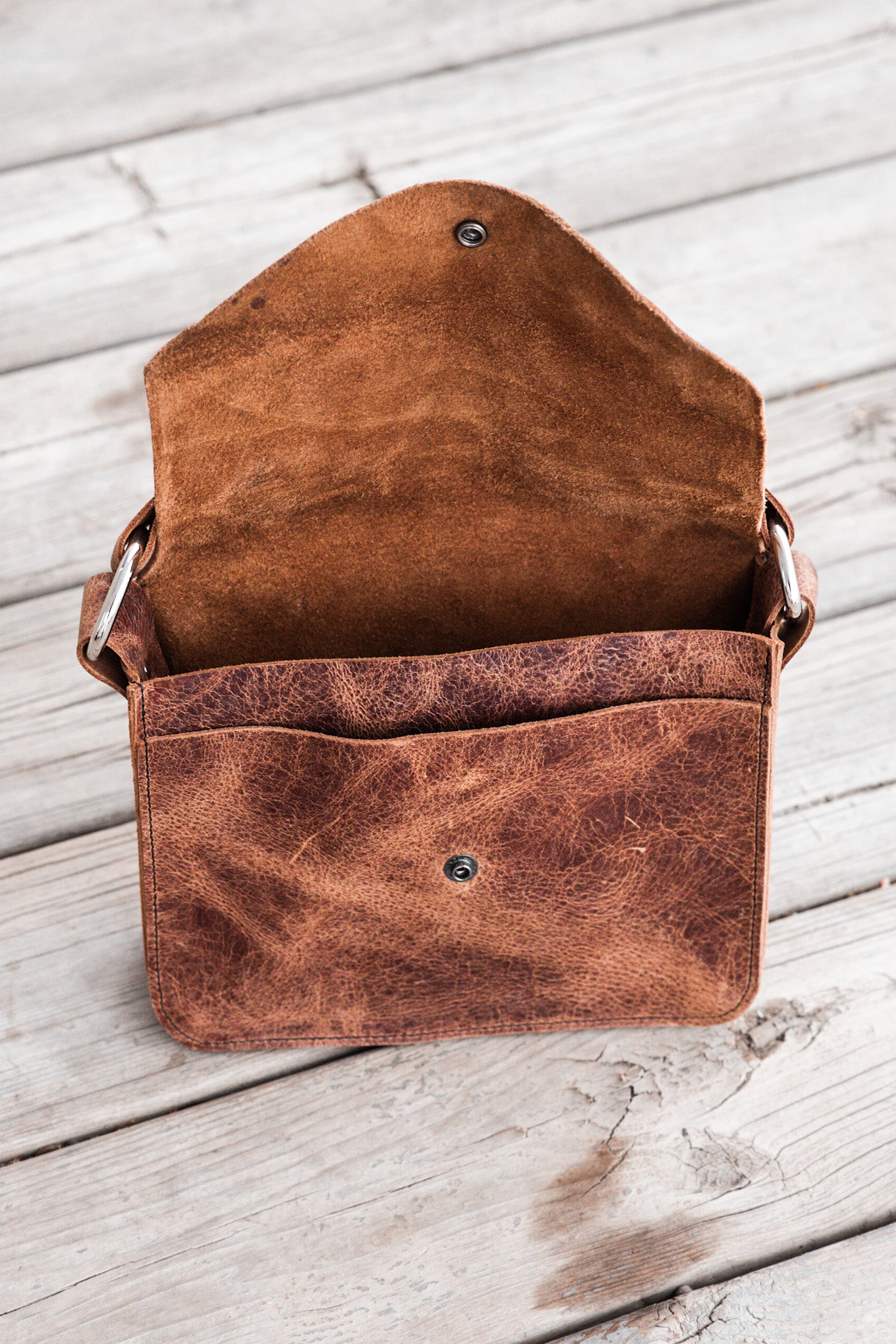 The Laredo is made with brown rustic looking genuine leather and has a simple stitched in side with a raw edge flap and snap closure.