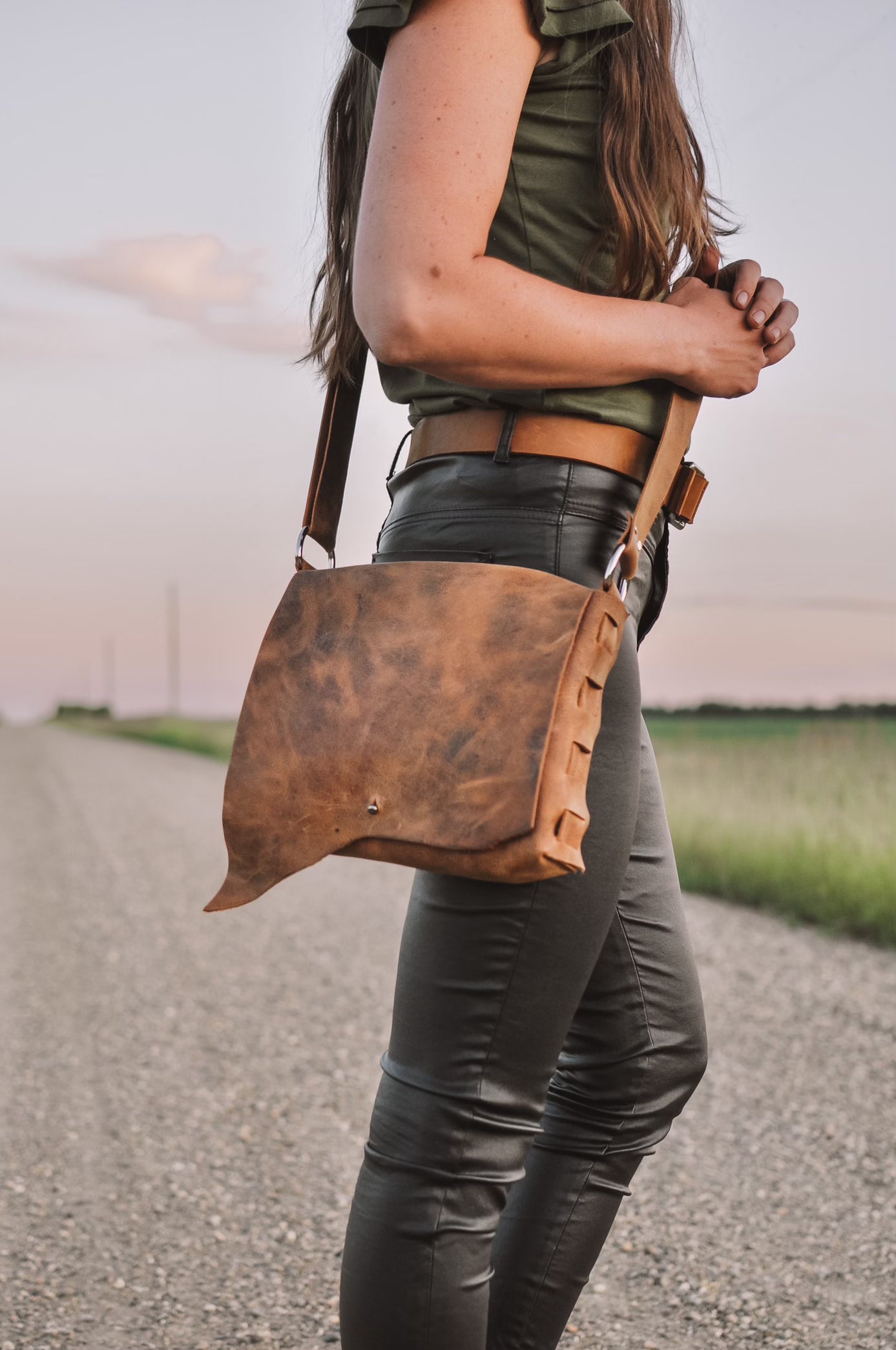 Made with soft brown rustic style genuine leather, this bag is 10” x 8” and has an adjustable 1.5” wide strap and a woven style side.