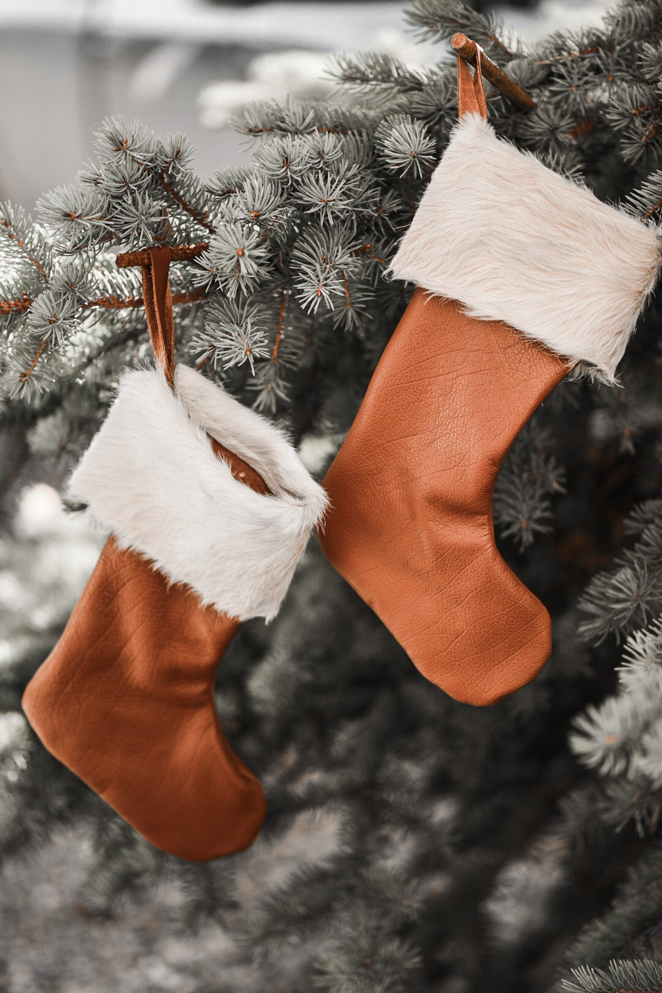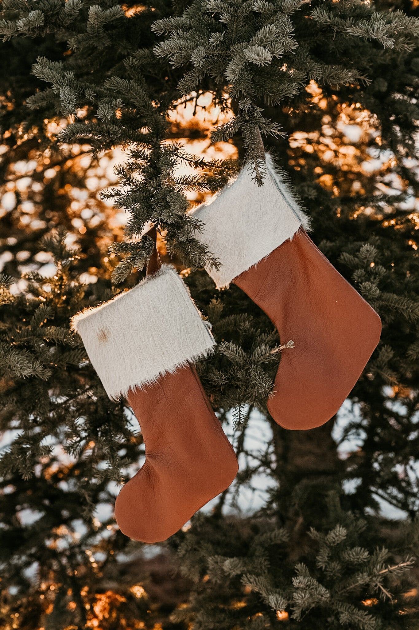 Made with real leather and white hair on cow hide. These classic Christmas stockings would be the perfect accessory for a modern farmhouse or any other kind of fire place!