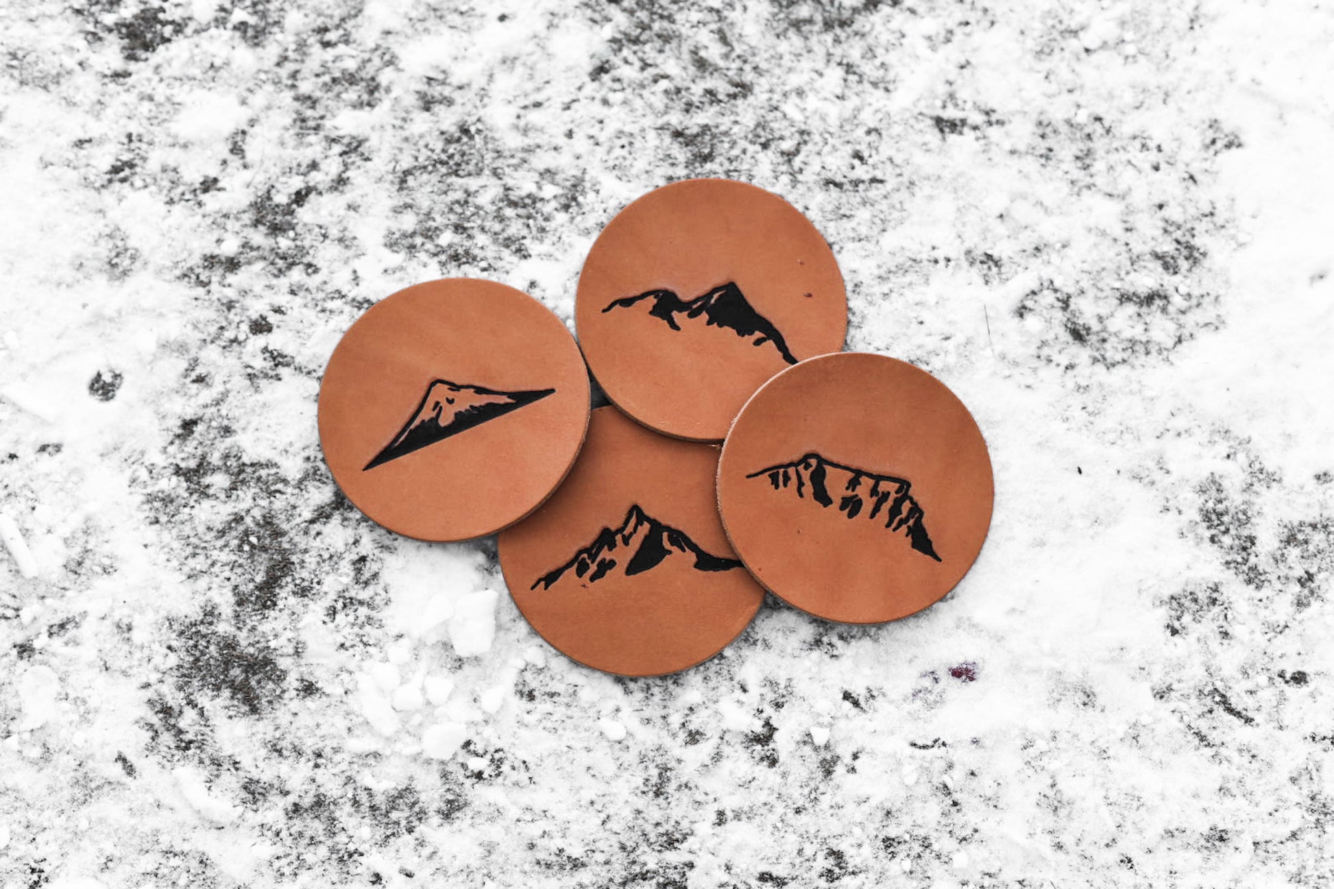 Set of 4 coasters with mountain designs laser engraved. 3.5” diameter and stiff leather approximately 5mm thick. Because of the nature of the leather each coaster will have its own unique markings and colouring.
