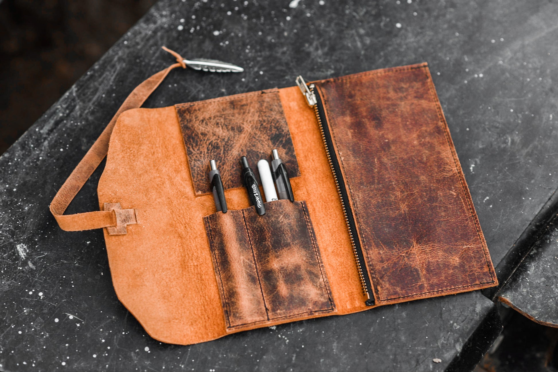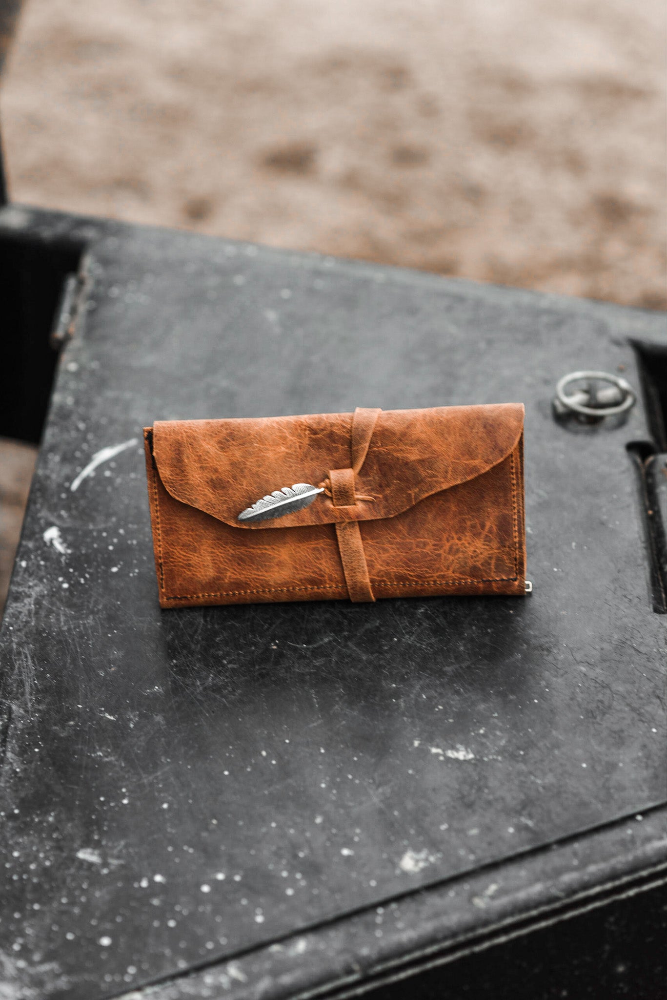 8.5” wide with a zipper pocket and four pen slots! Closed with a wrap and feather charm