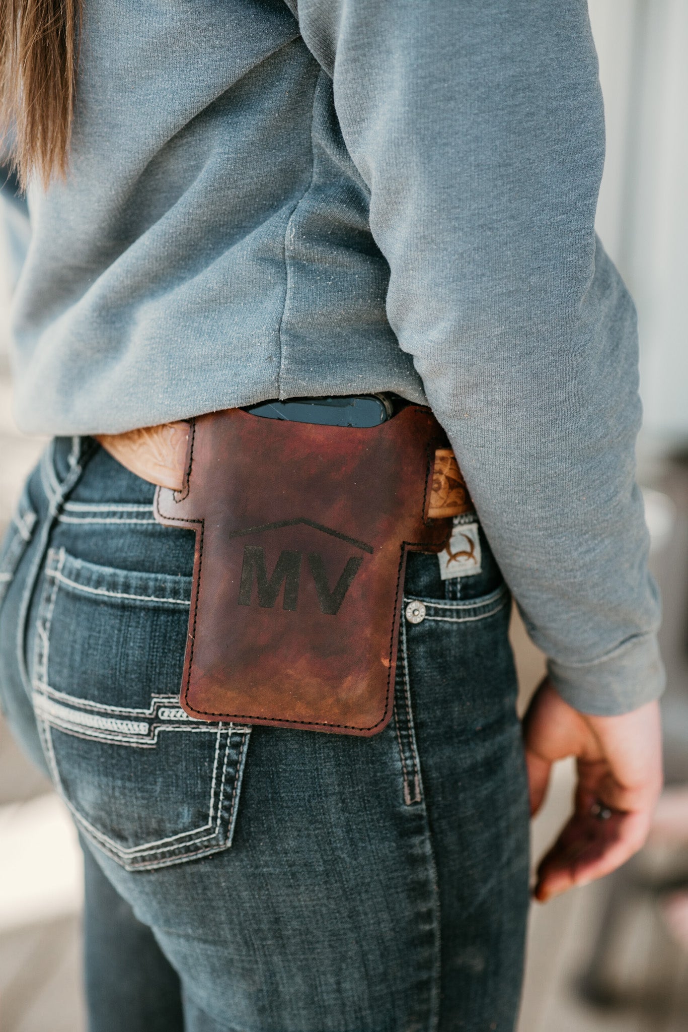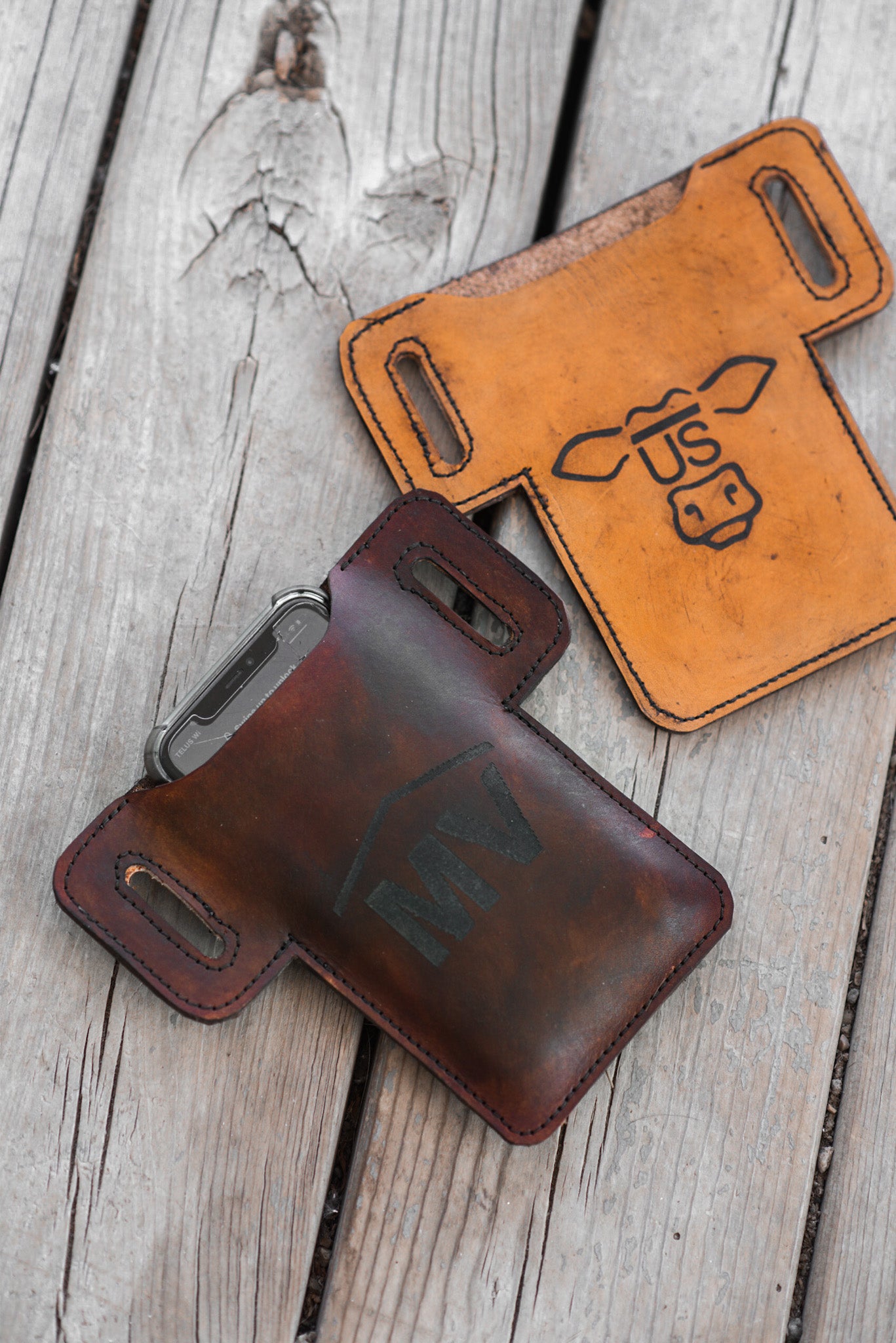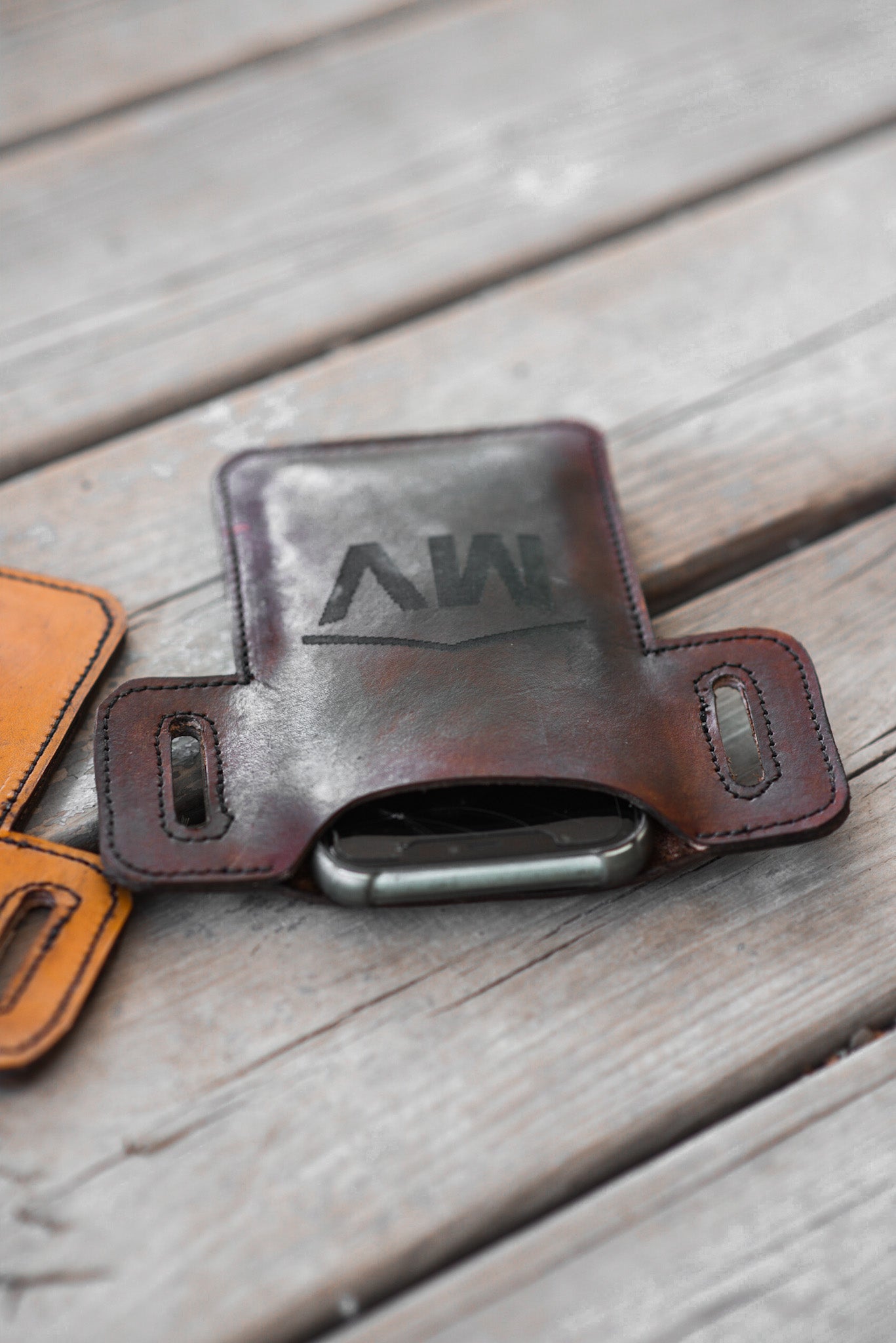 Leather hand dyed, machine stitched phone case. With or without engraving. Fits phone sizes up to 6”x 3”.