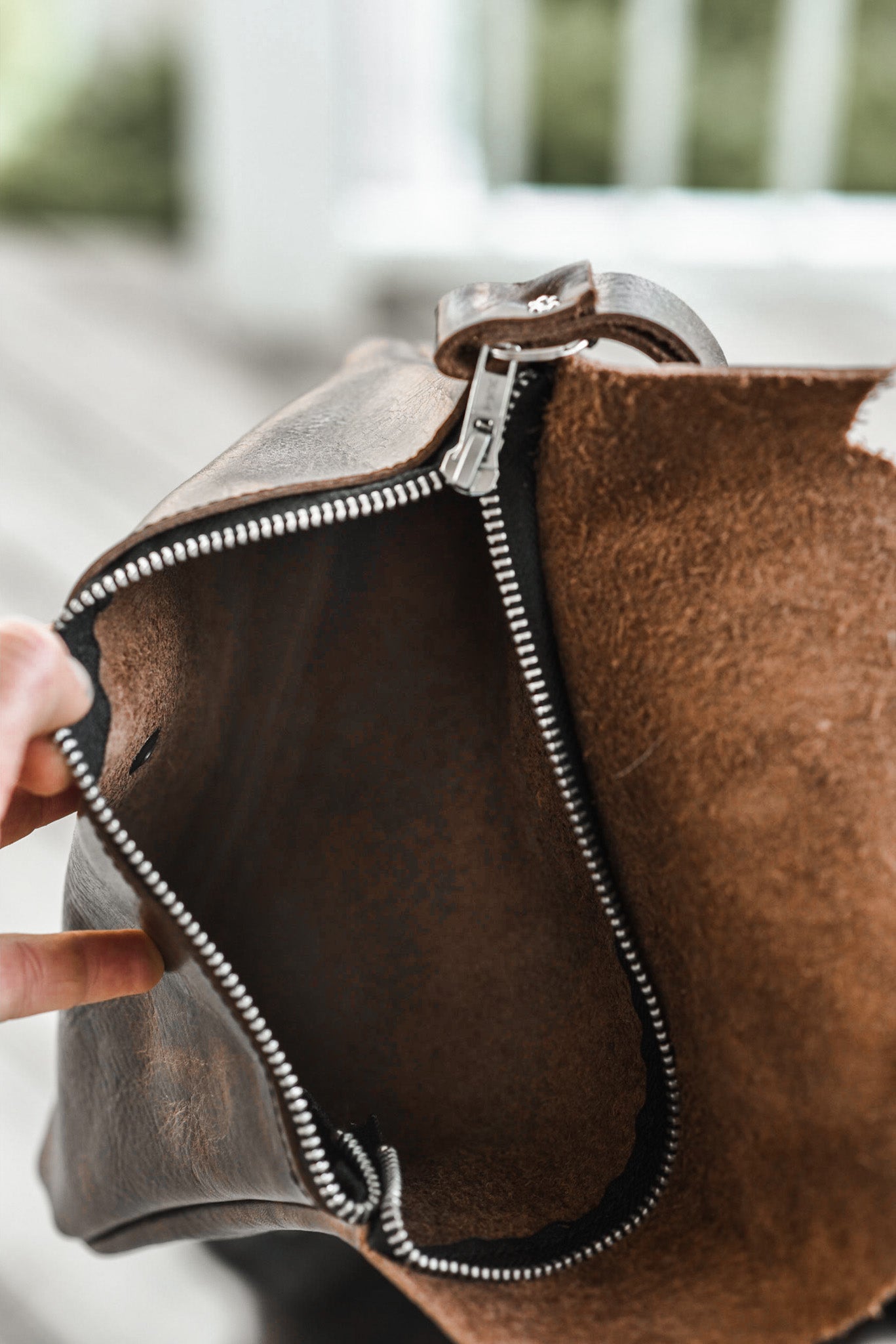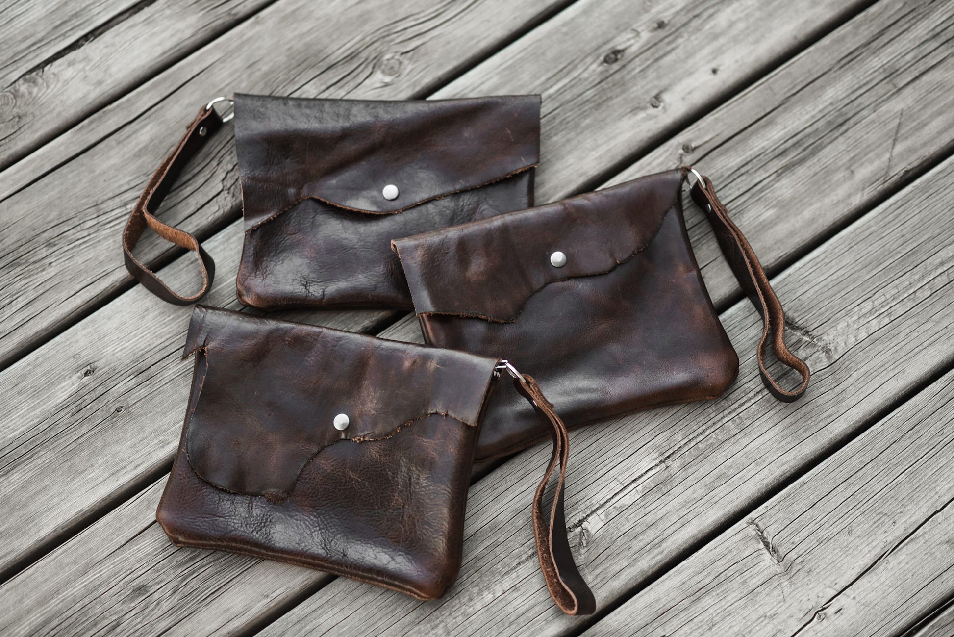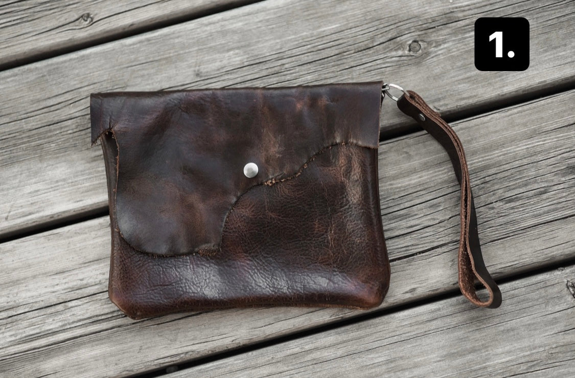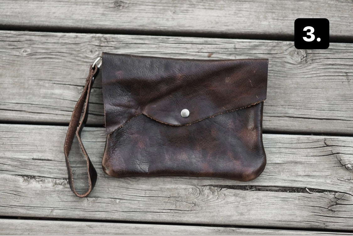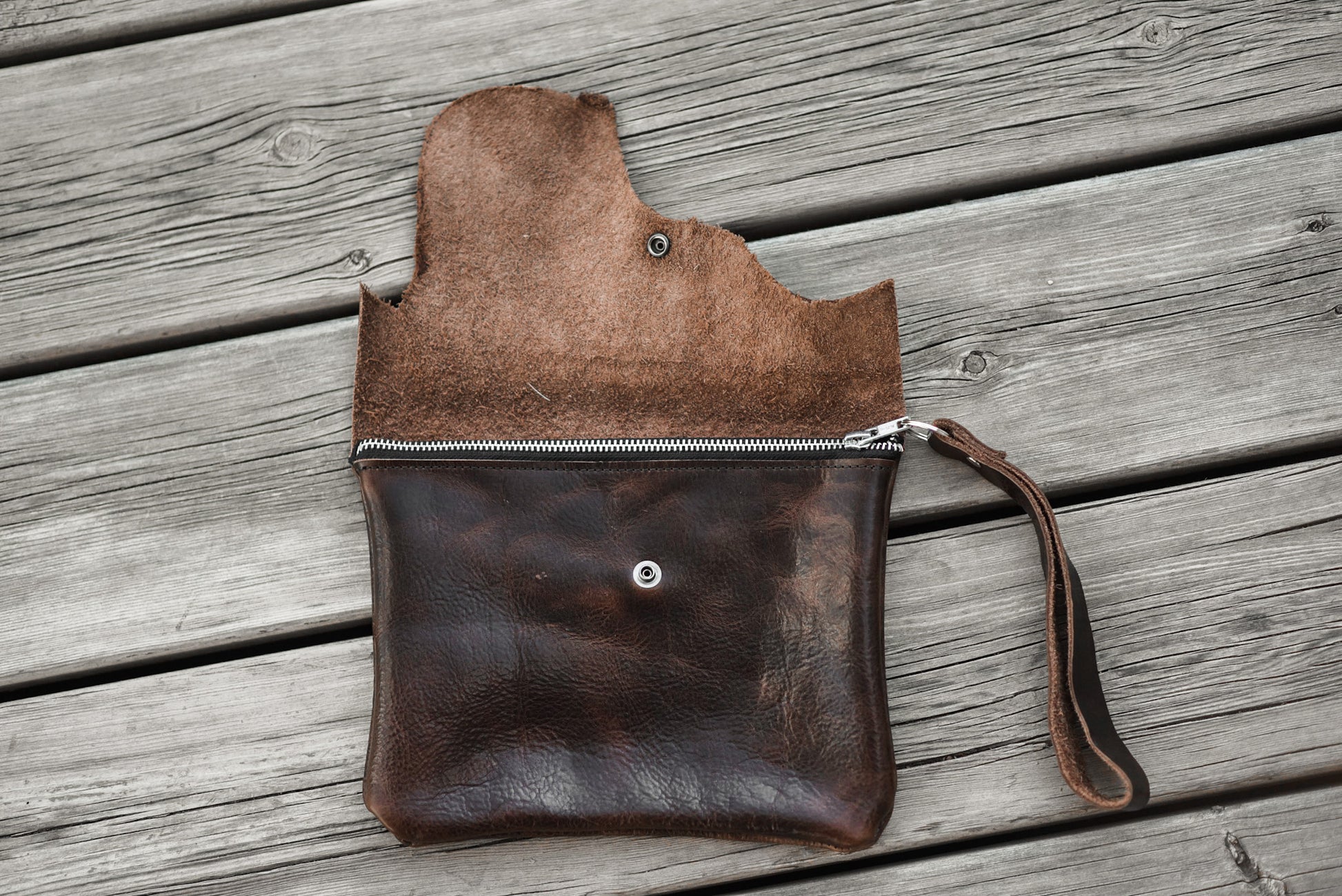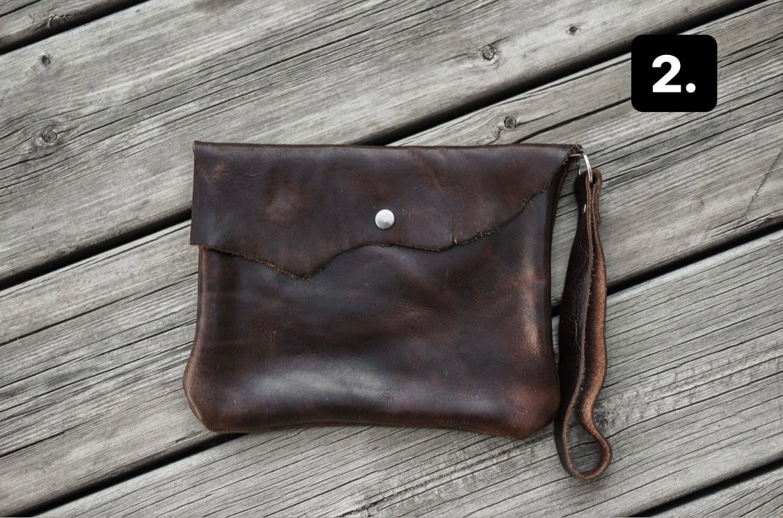 This wristlet clutch is 9” x 7”, made with dark brown genuine leather and has both a snap and a zipper closure. One big compartment on the inside and a riveted wristlet strap.
