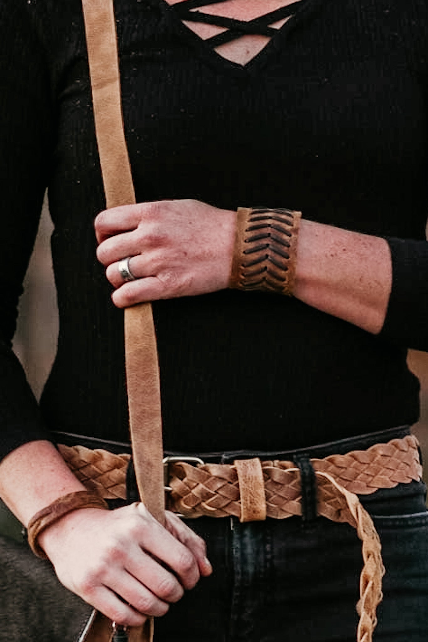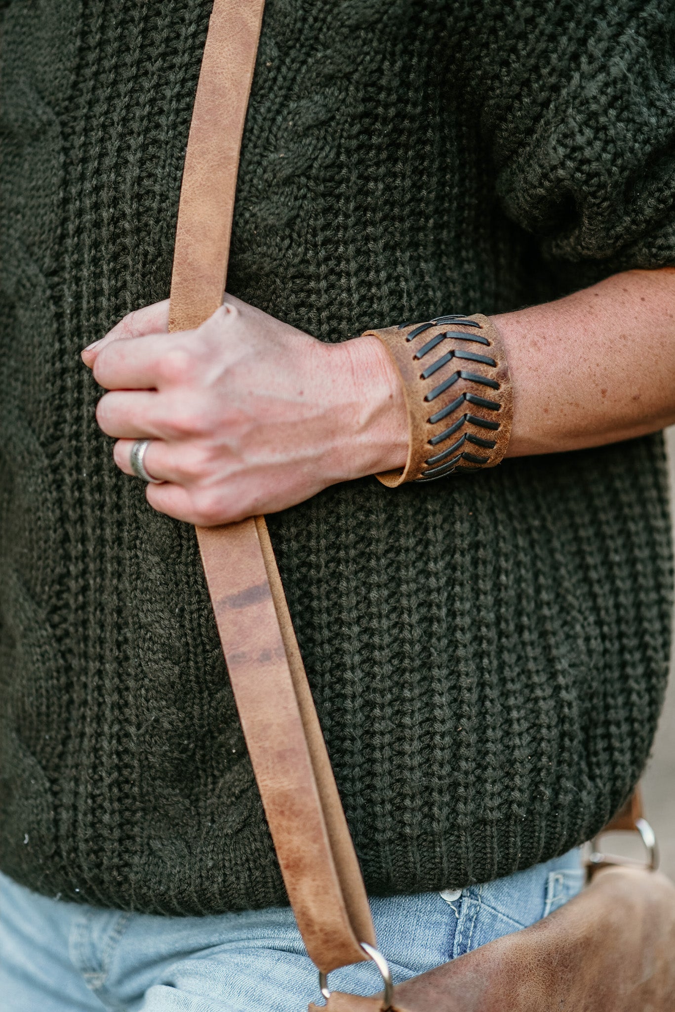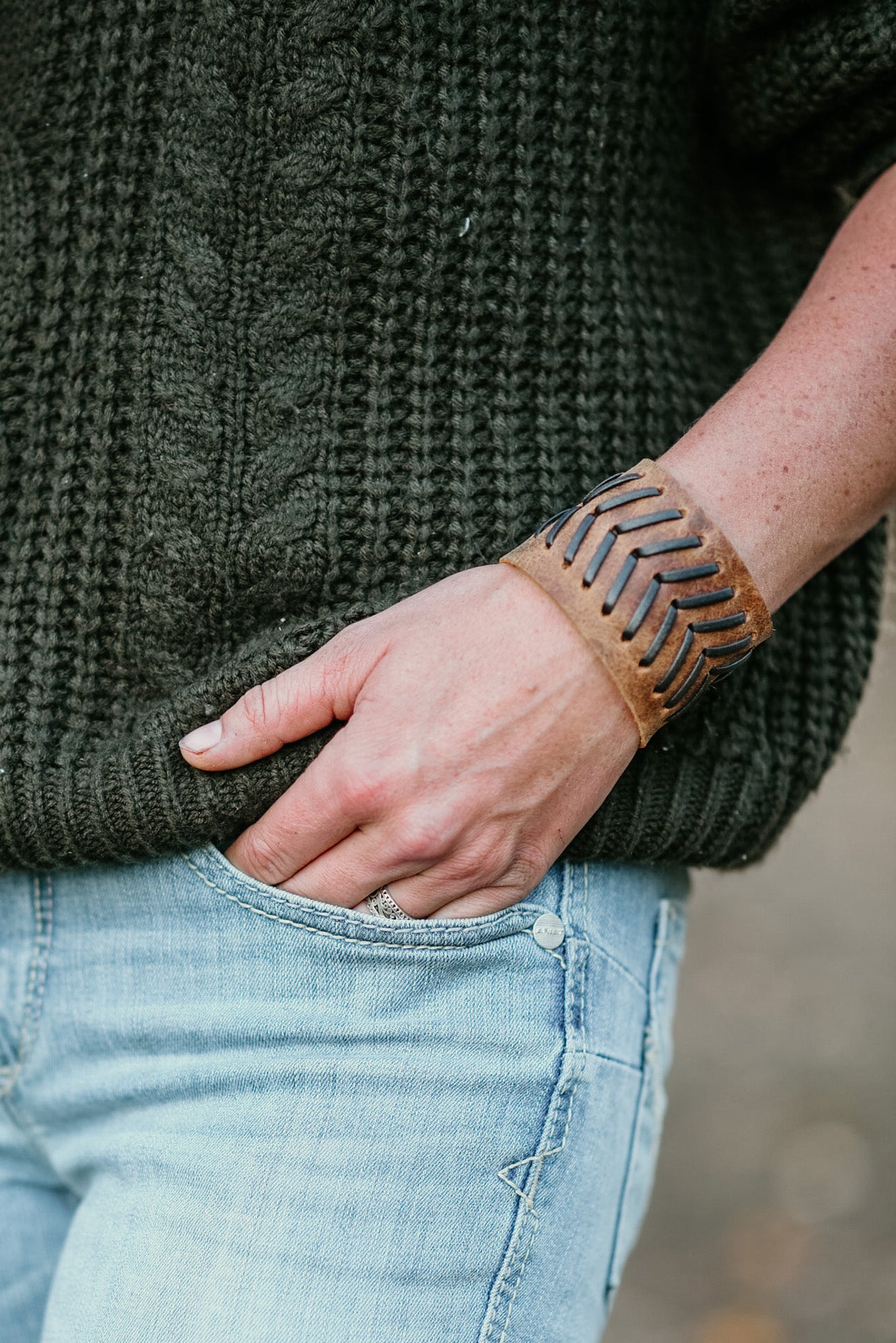 Brown leather bracelet with black leather lace threaded through in a V shape. Snap closure.