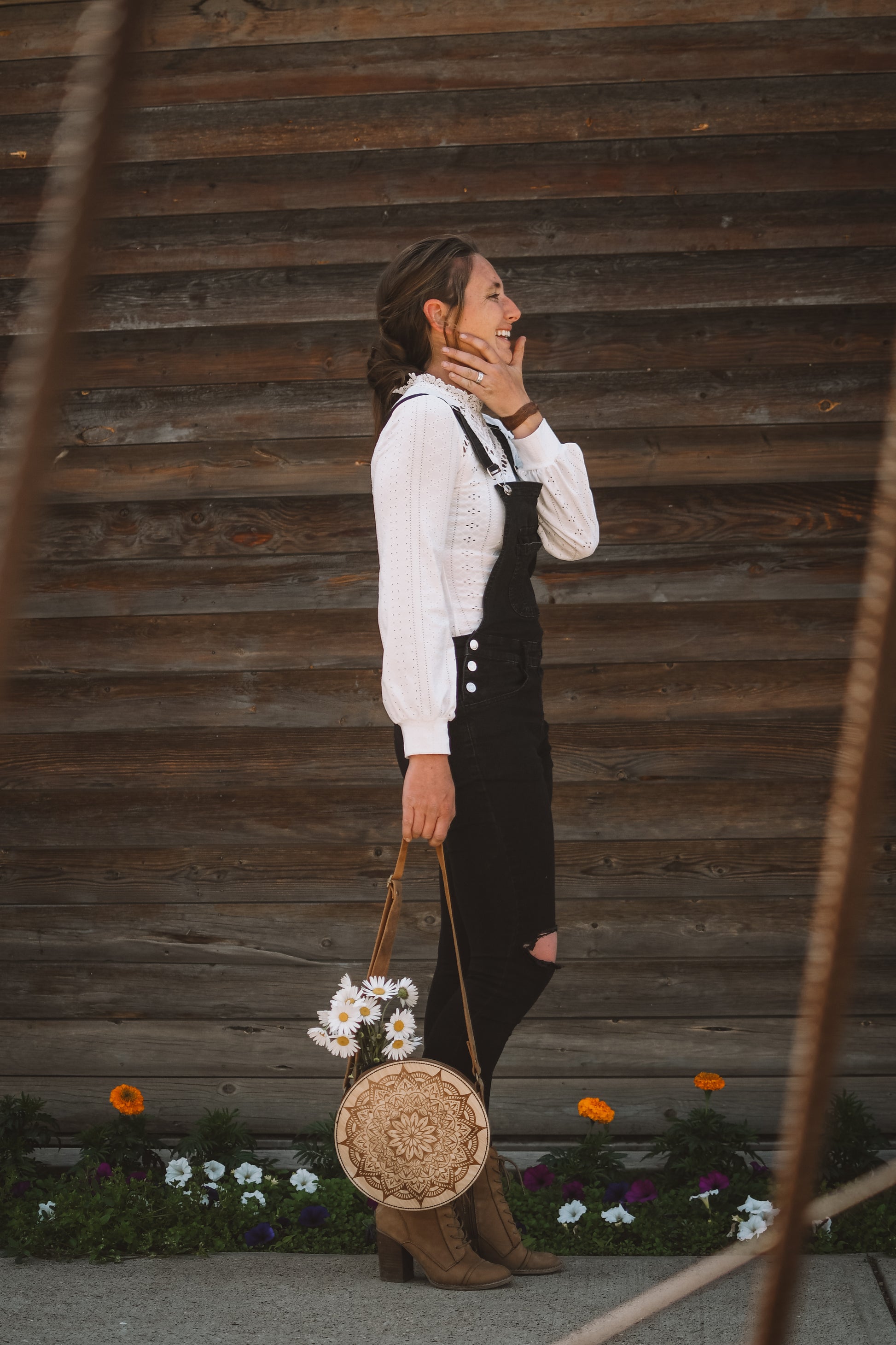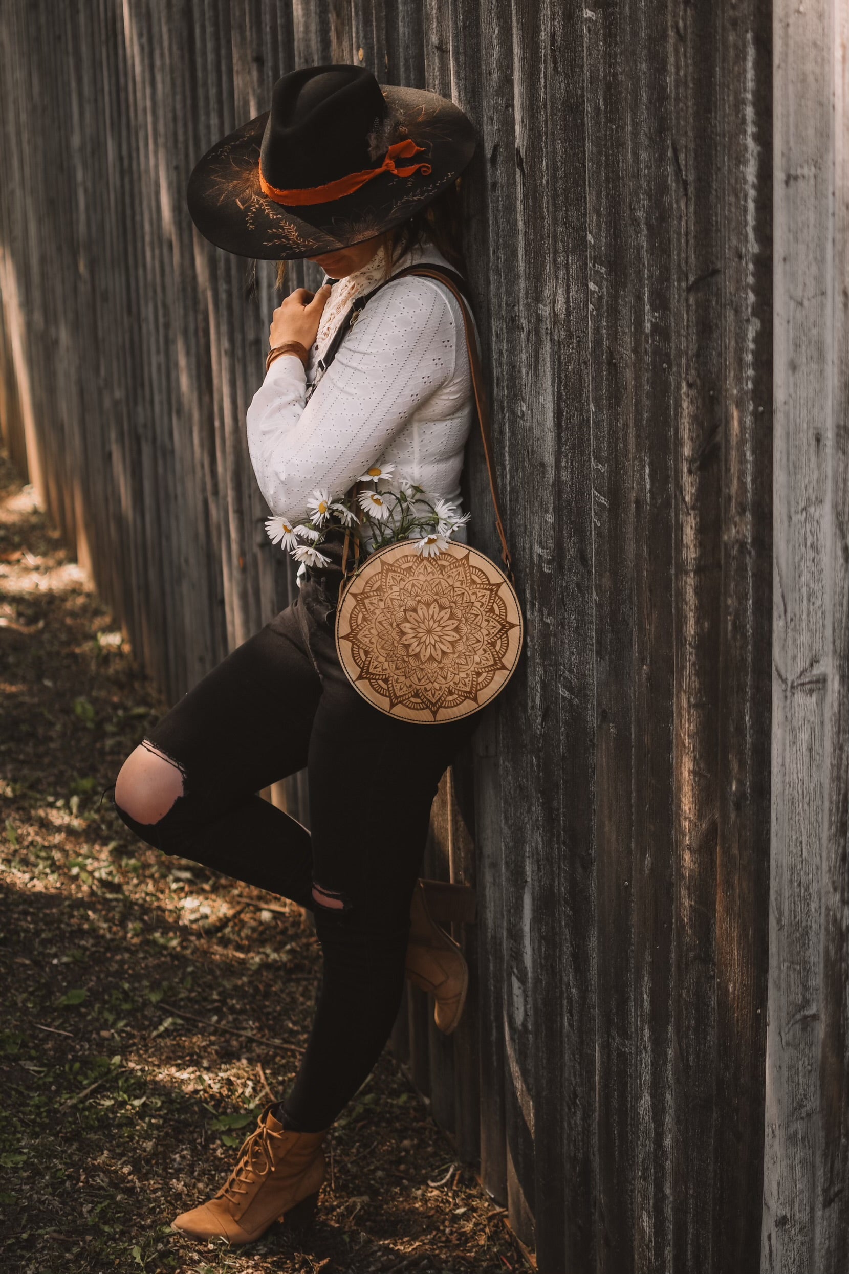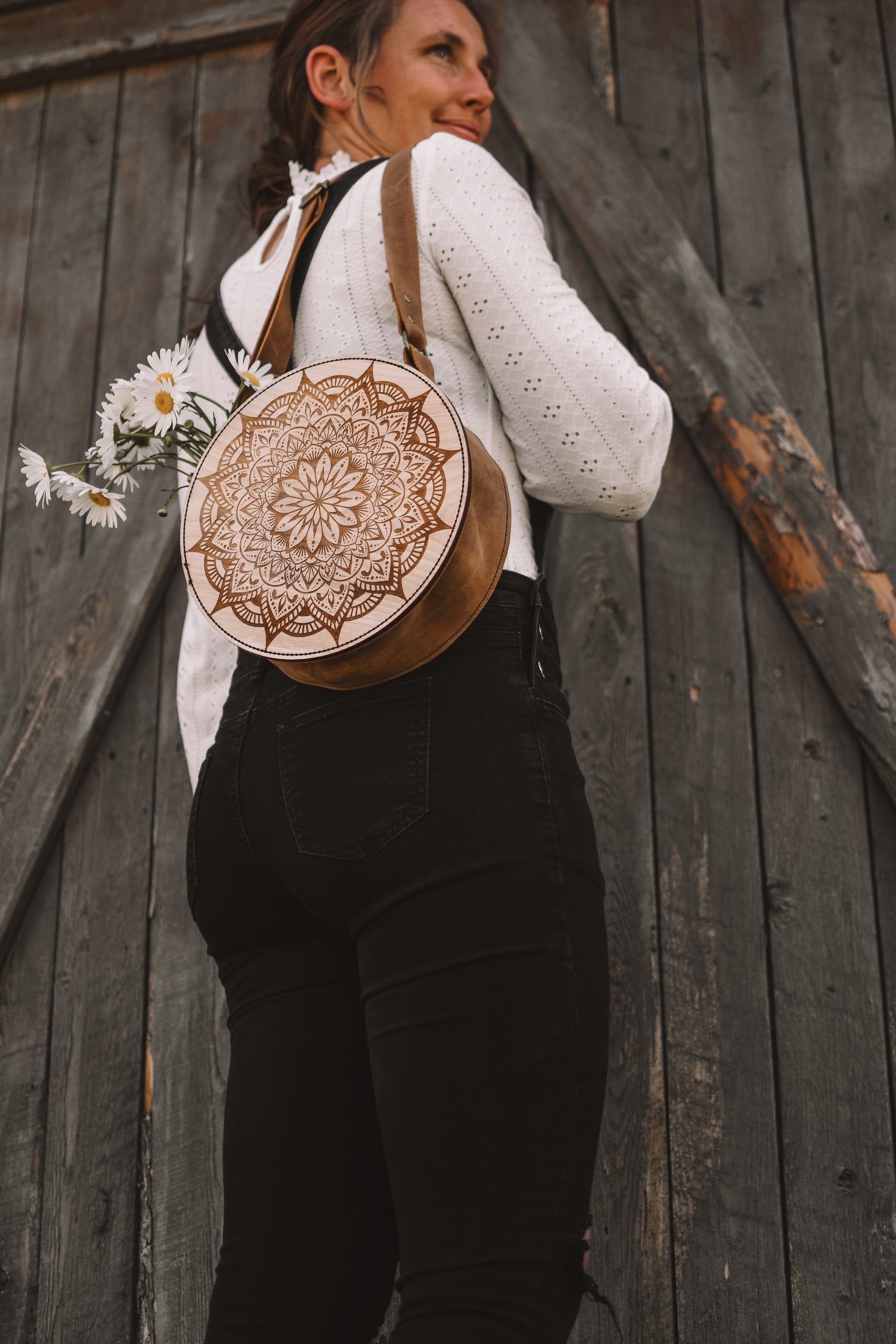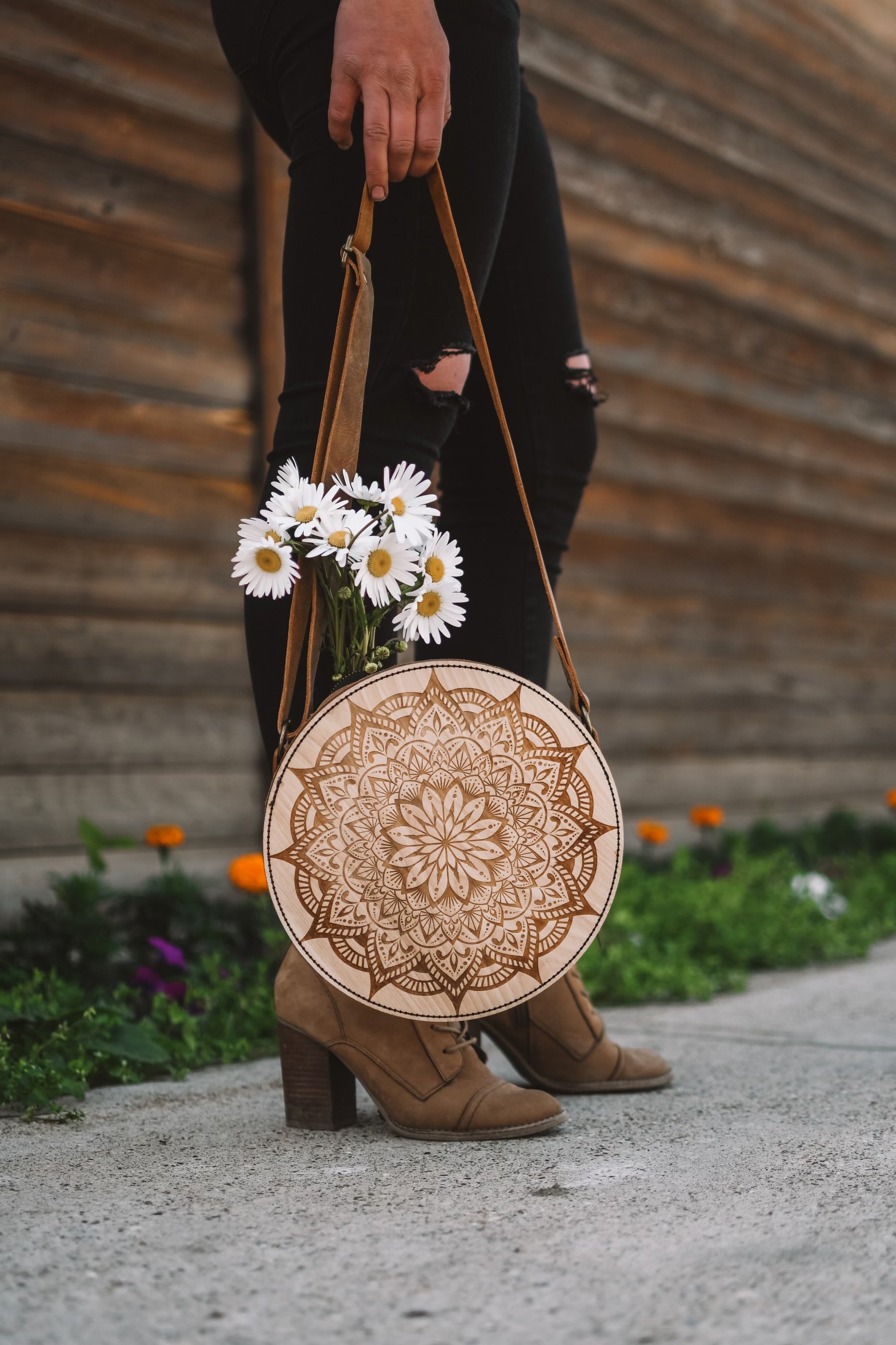 The wood panel has mandala style engraving on it! Zipper closer, adjustable strap and one big pocket inside.
