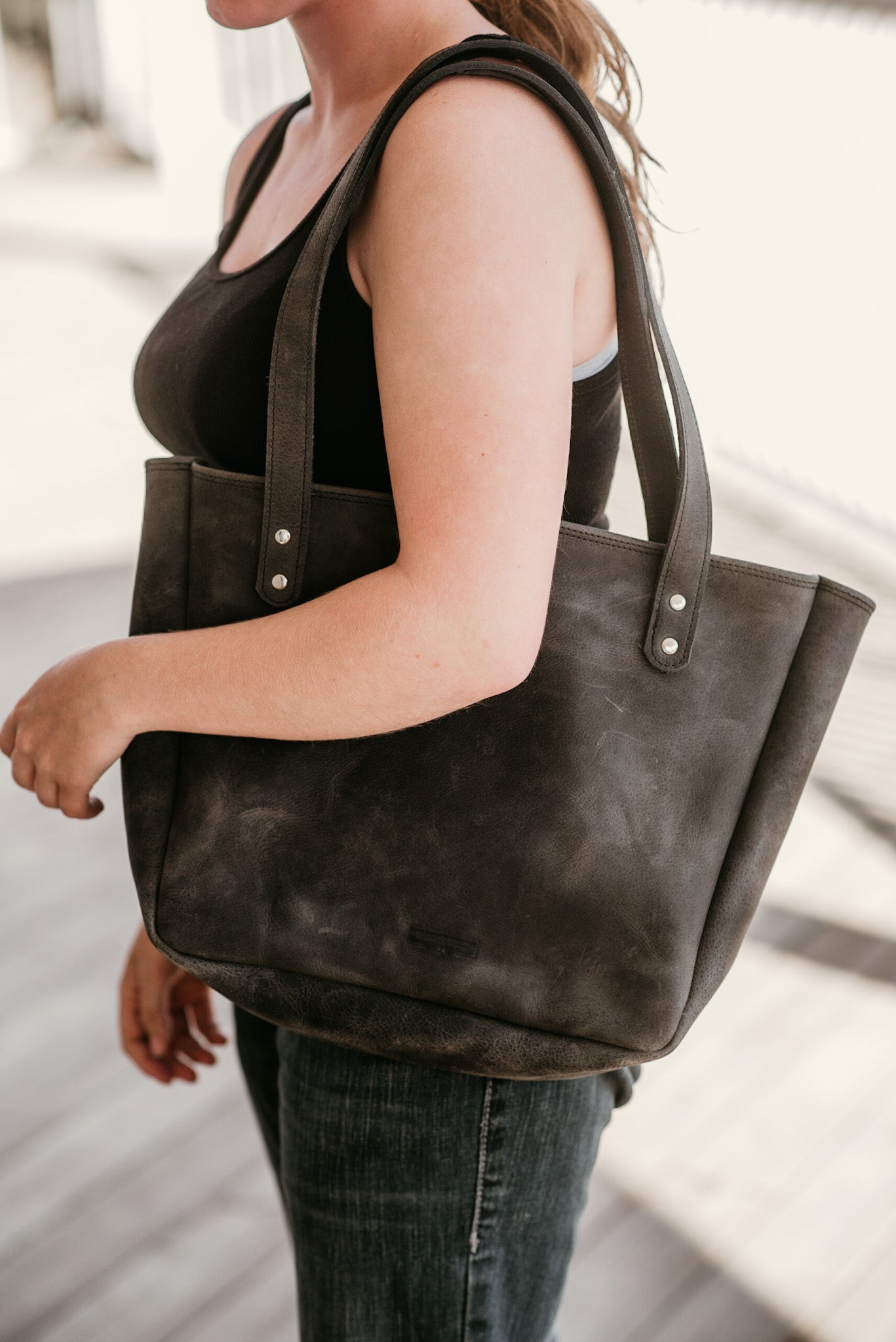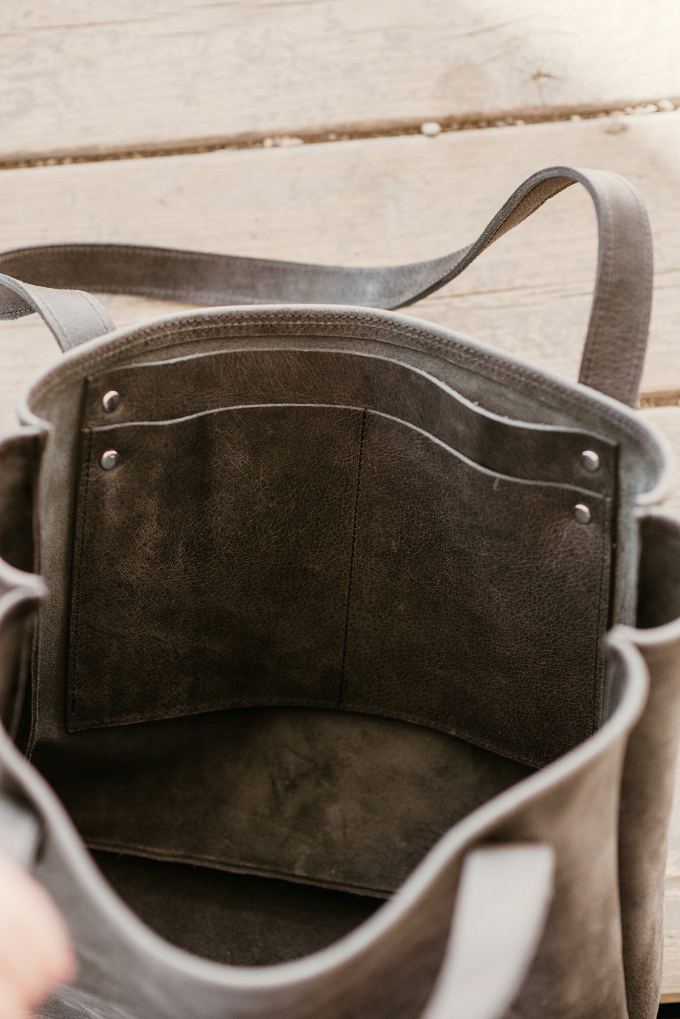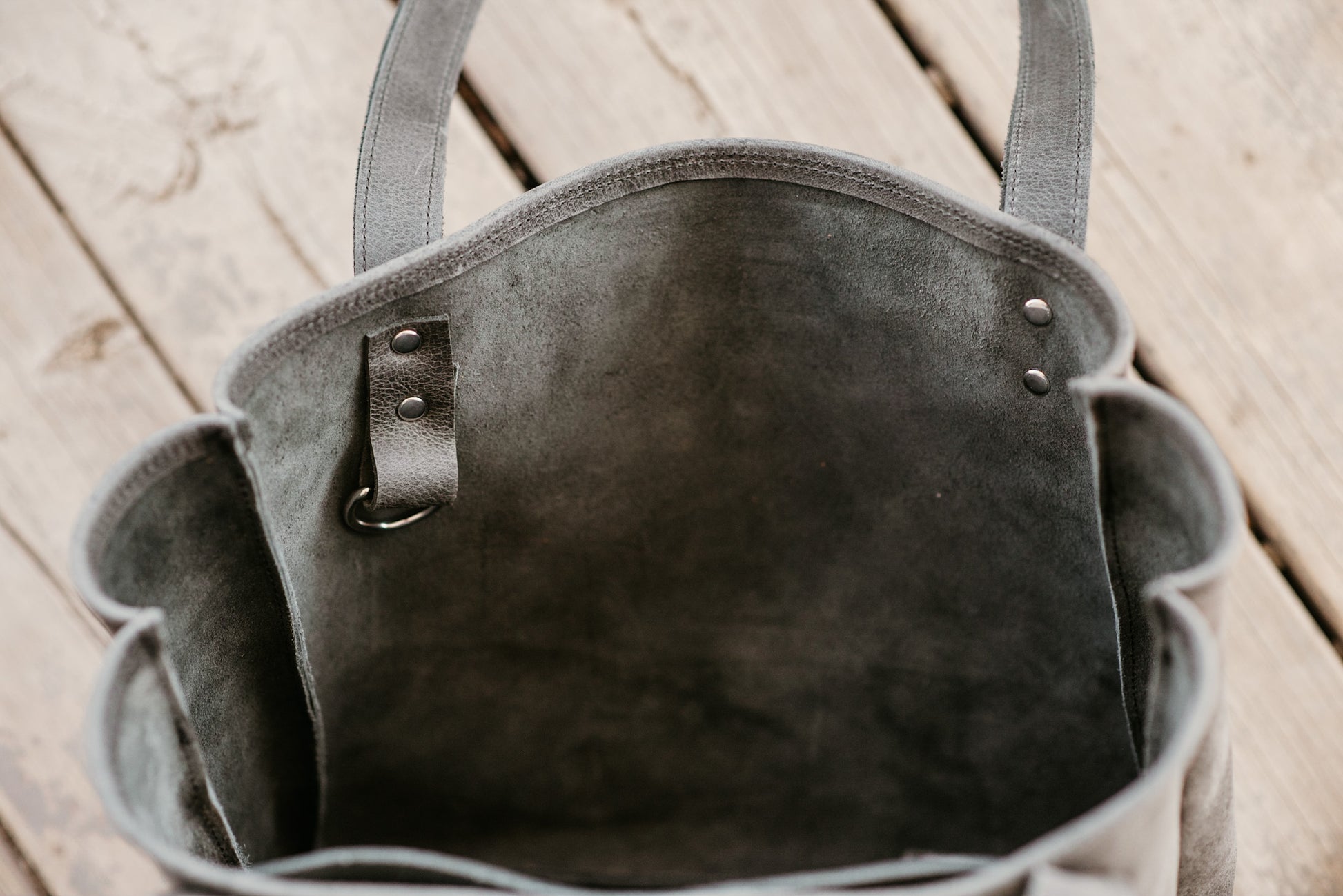 14” wide by 11” tall and 3.5” deep. This tote bag has a keychain ring on one side and two phone sized pockets on the other. Double riveted with double thickness 11” long handles. Made with charcoal genuine leather.