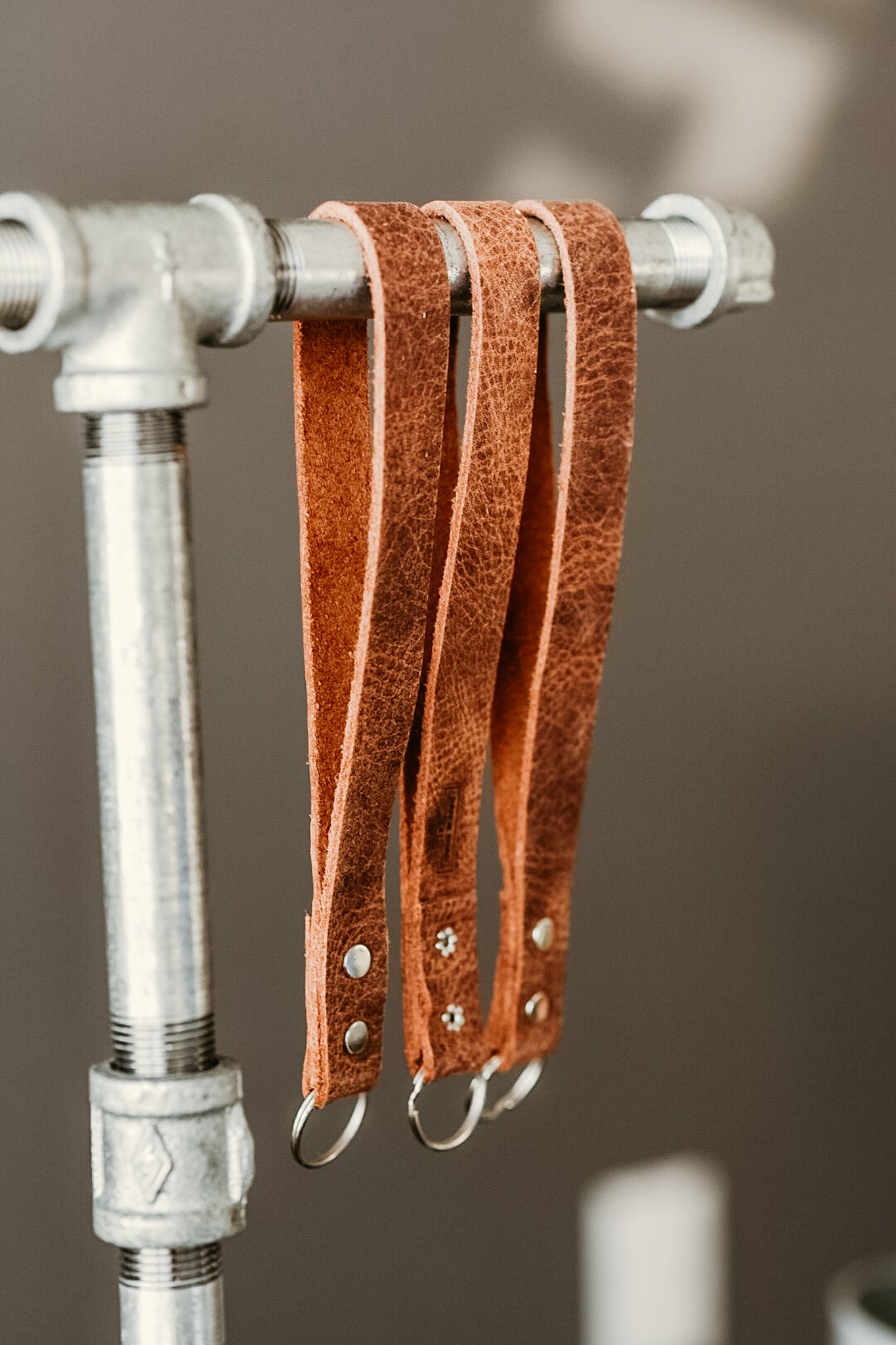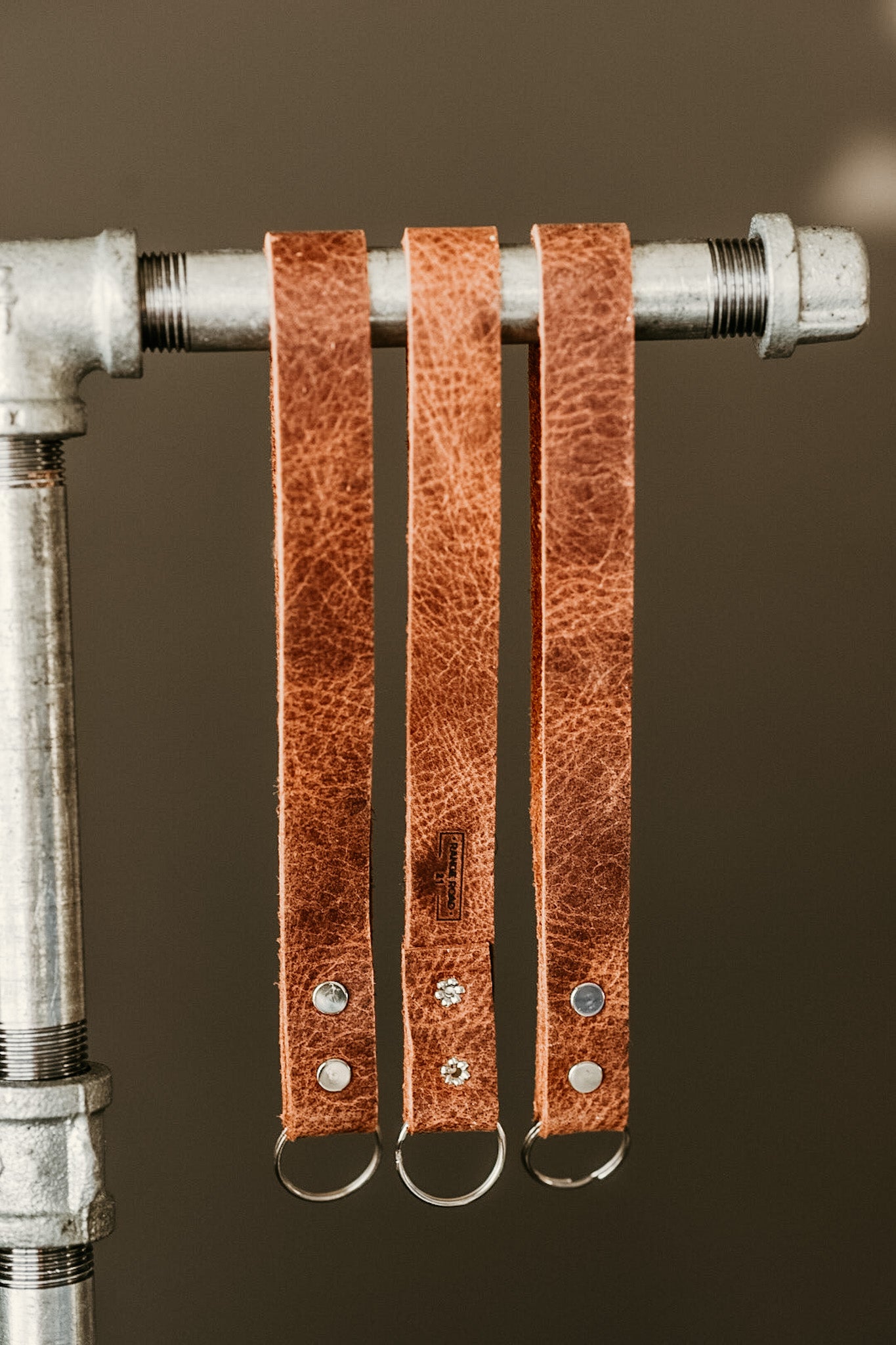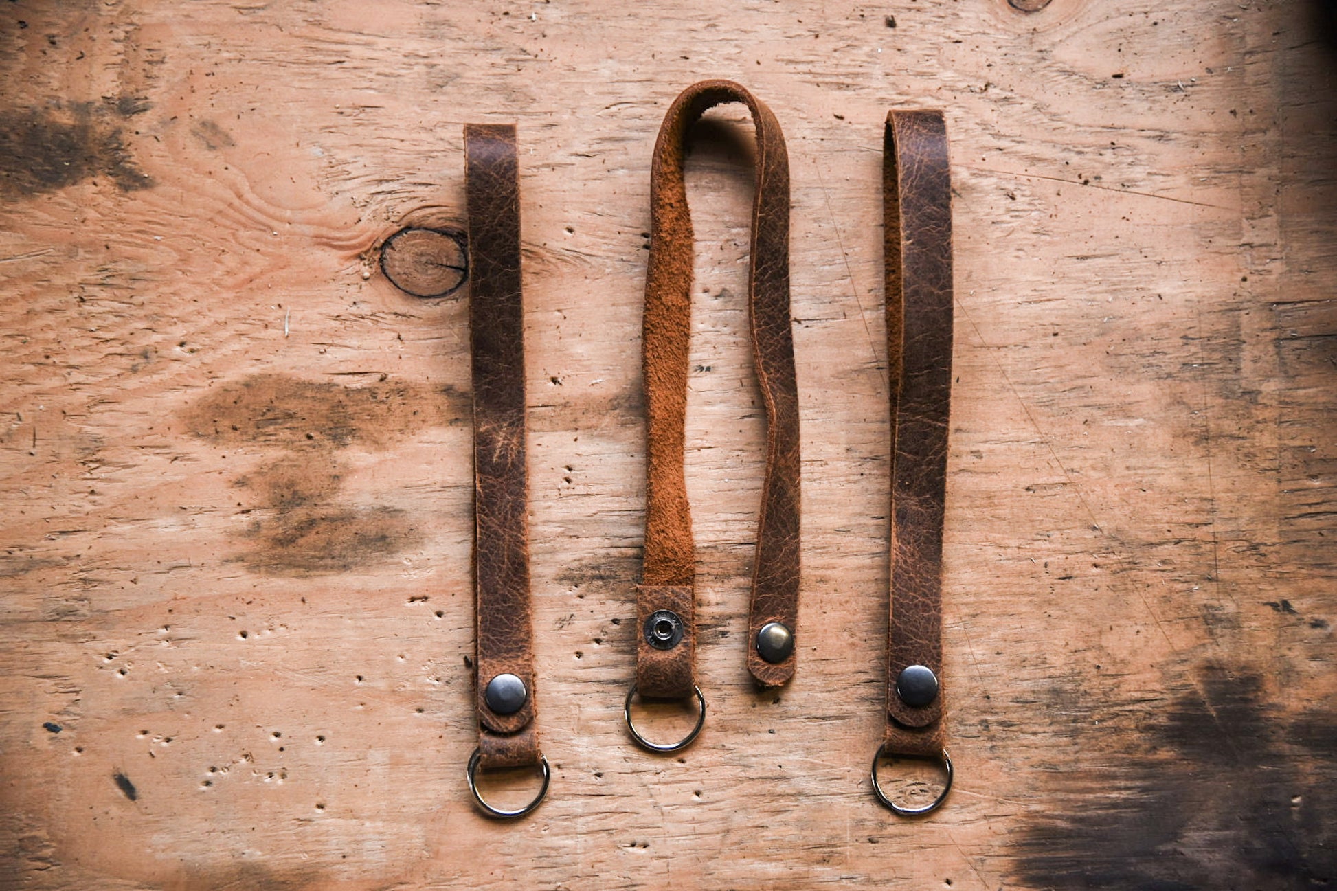 Wristlet key chain. Option of a snap closure. Just over half an inch wide x 8”- 8.5”.