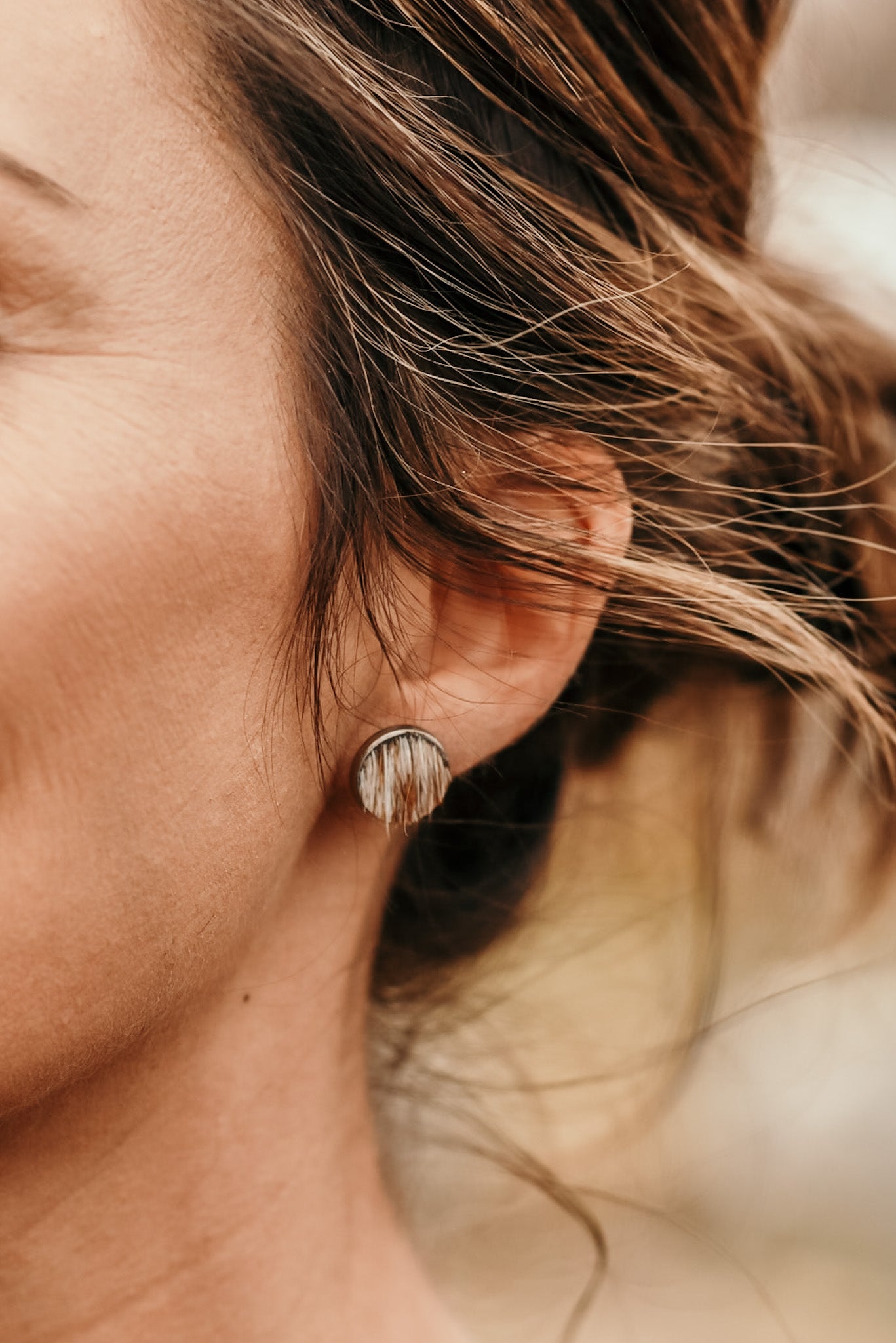 Small button stud style earrings made of black hair on cowhide. 1/2” across and encased in a silver casing