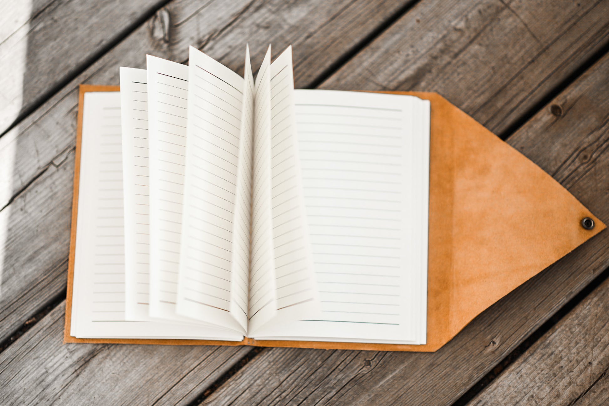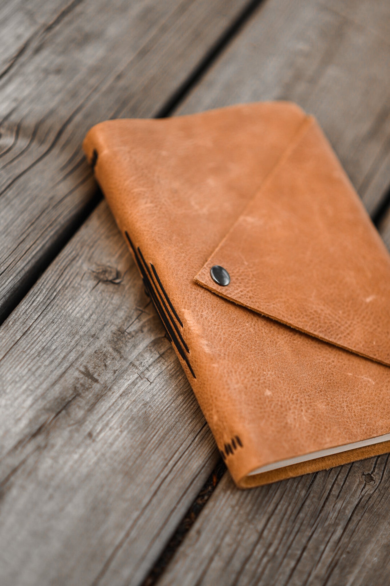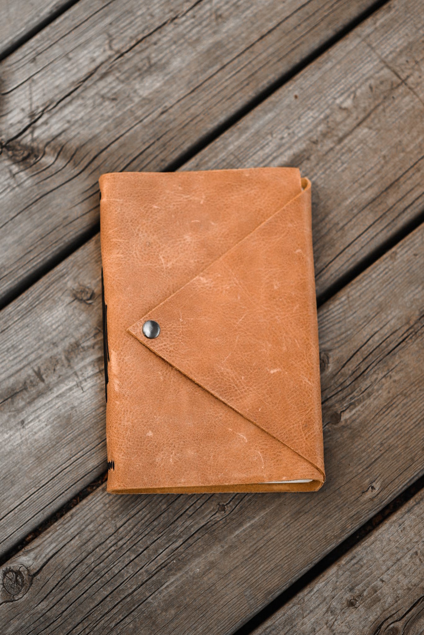 Tan distressed leather journal with snap closure. Approximately 9” tall x 6” wide with 120 lined pages. Geometric style stitching for the binding.