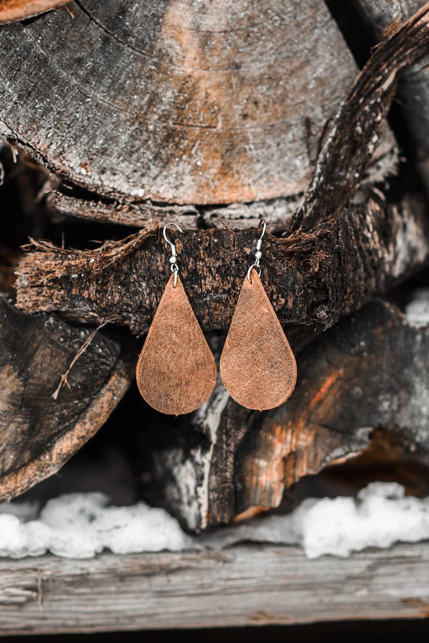 Genuine water buffalo leather tear drop shape dangle earrings. The leather is 2” long and a little over 1” wide at the widest part.