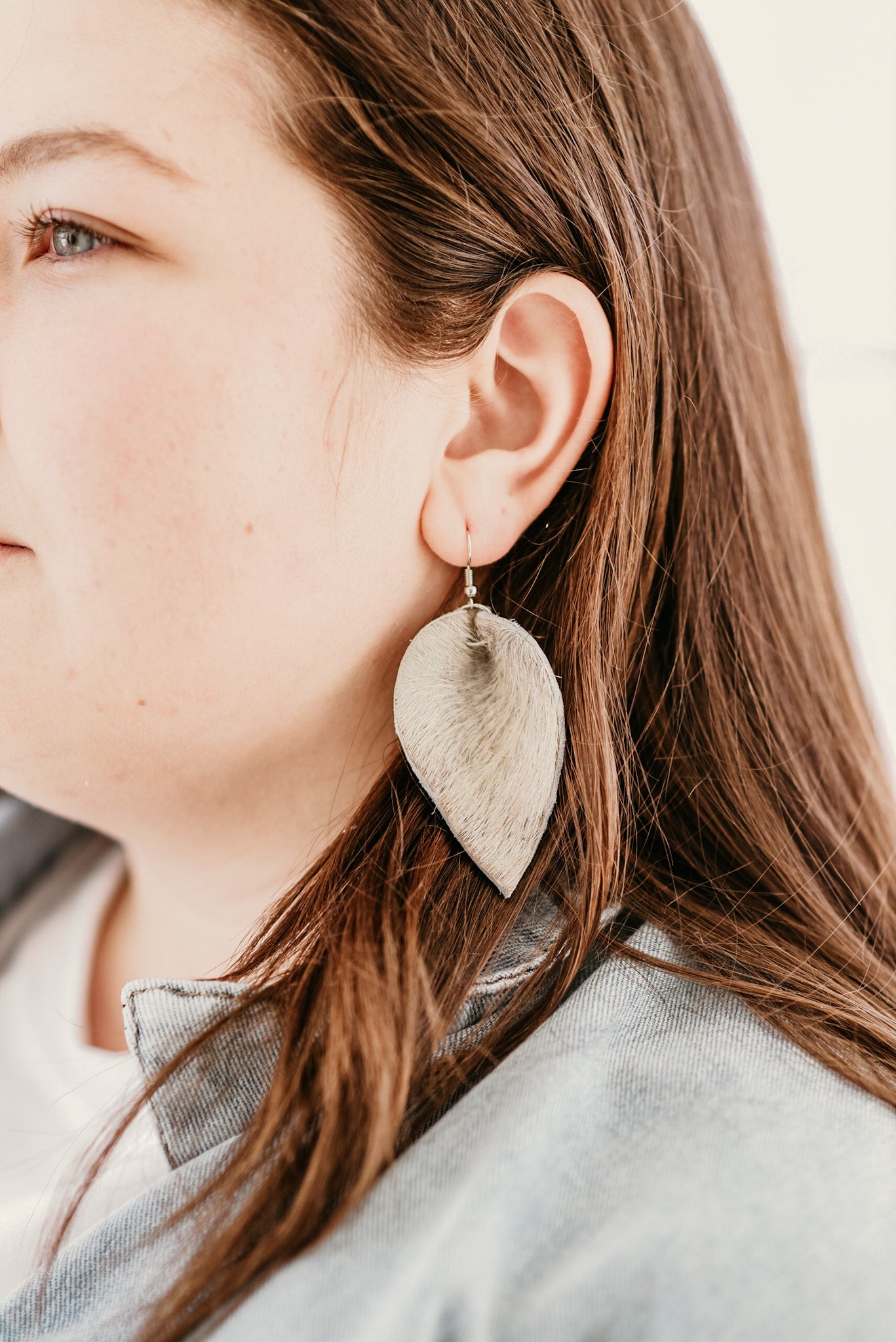 White hair on hide teardrop earrings. The teardrop is roughly 2.5” long plus the earring hook and not quite 2” wide. Just the ones if you’re looking for that little bit of western fashion flair!